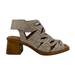 Il Sandalo firmato Cayetano Gimenez, nella variante taupe realizzato in pelle è caratterizzato da una lavorazione traforata e da comodo strappo sulla caviglia, presenta un tacco largo effetto legno alto 5,5cm.
