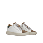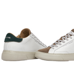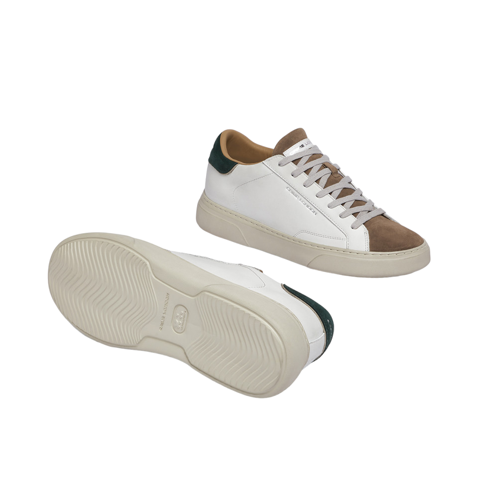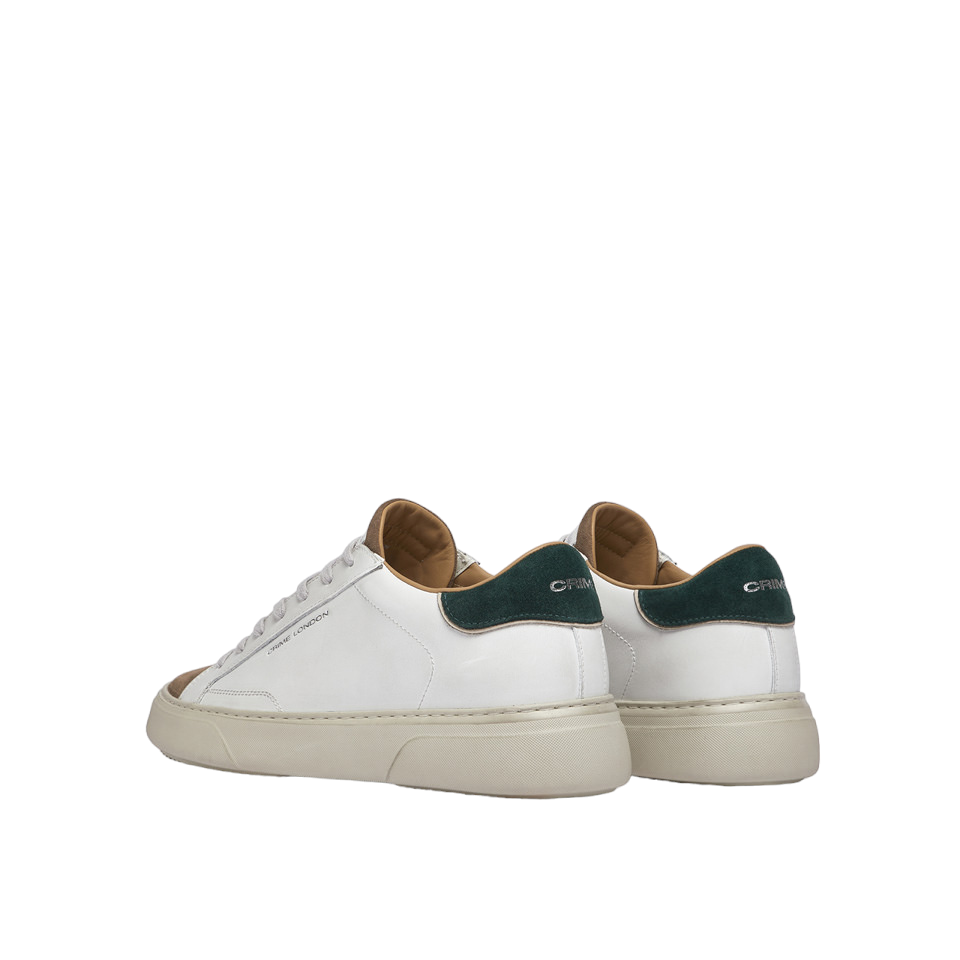 La Sneakers firmata Crime London, realizzata in pelle spazzolata bianca con tallone in suede verde bosco è caratterizzata da linguetta in suede marrone con label bianca in pelle logata e da una fodera marrone nocciola in pelle e tessuto con suola extralight® white smoke con texture diamond.