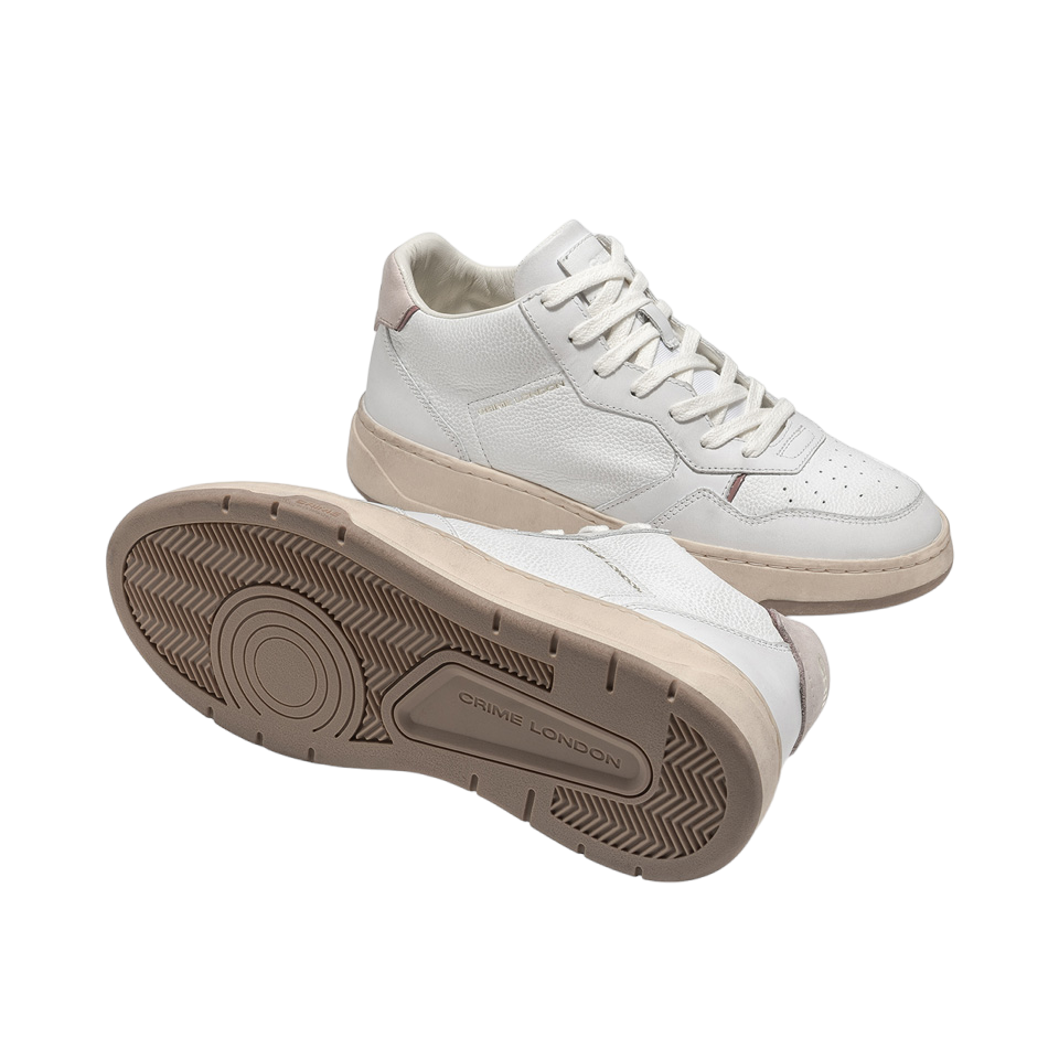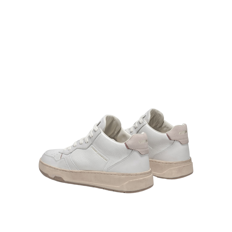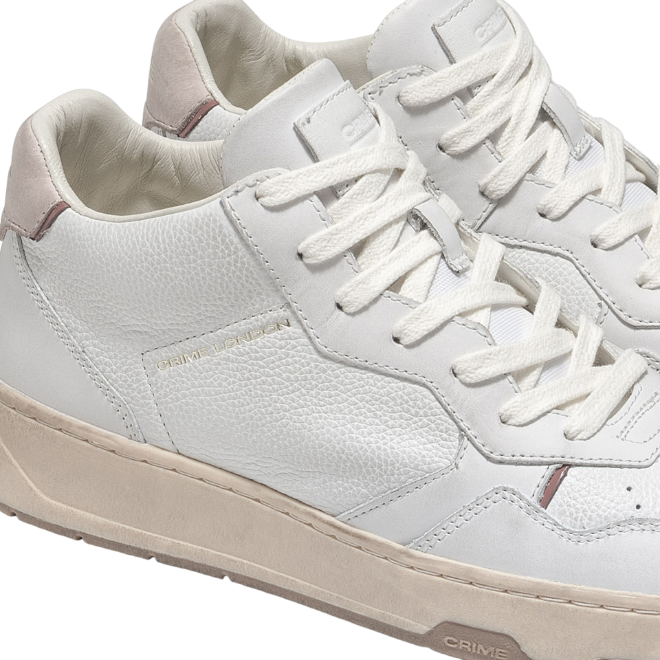 La Sneakers firmata Crime London, realizzata in pelle bianca traforata con tallone in nubuk rosa antico e dettagli in pelle liscia è caratterizzato da linguetta in pelle liscia e tessuto con label logata e da fodera in pelle off white e tessuto con suola in gomma cream con battistrada marrone logato Crime.