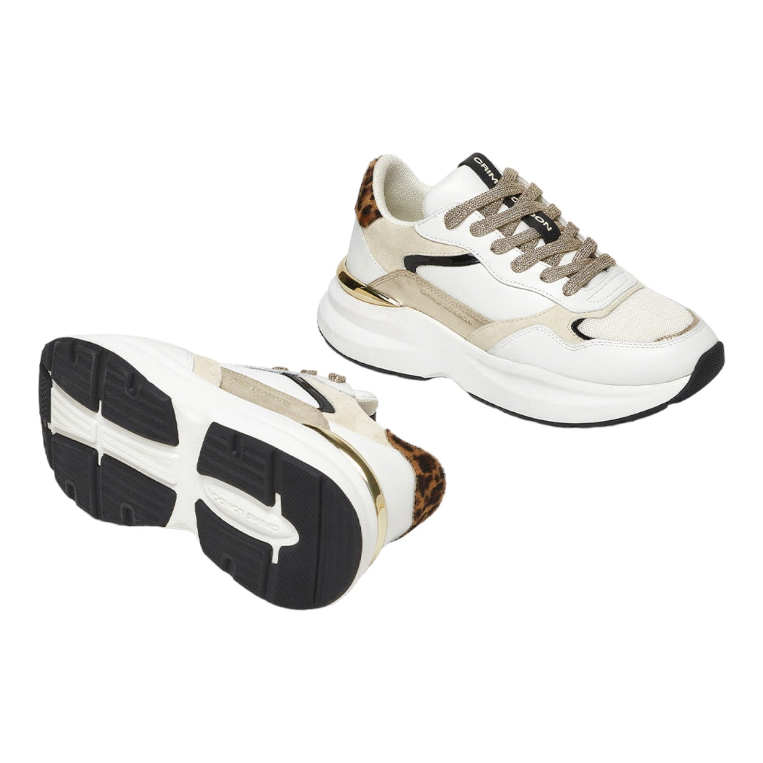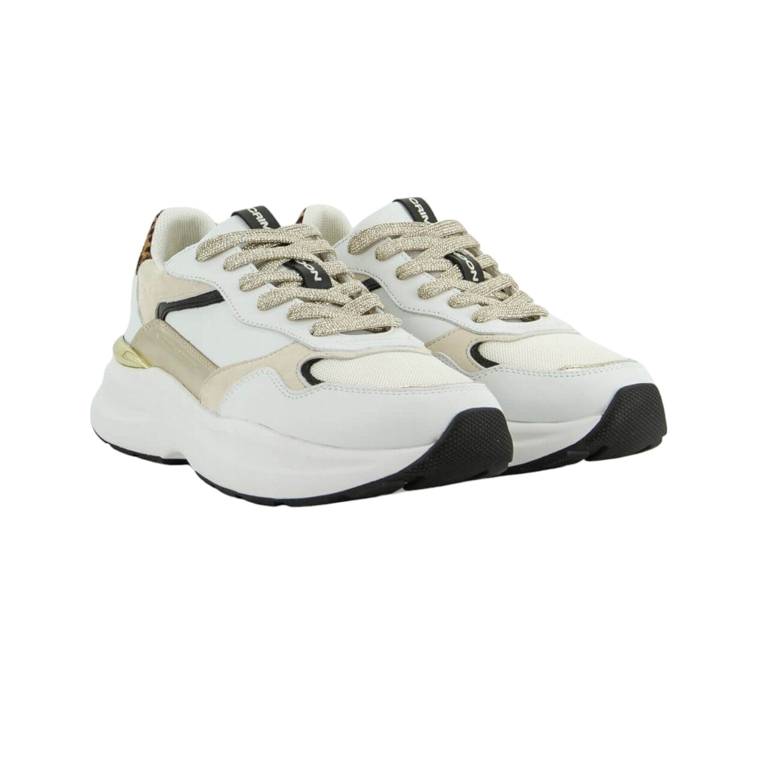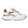 La Sneakers firmata Crime London, realizzata in tomaia patchwork oro e animalier con mix di cavallino, pelle, lamina, mesh e vernice, è caratterizzata linguetta con label in tessuto logata e lacci lame' oro con suola in gomma bianca con stabilizer oro e fondo nero.