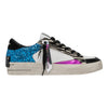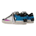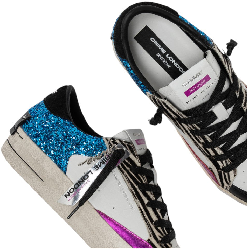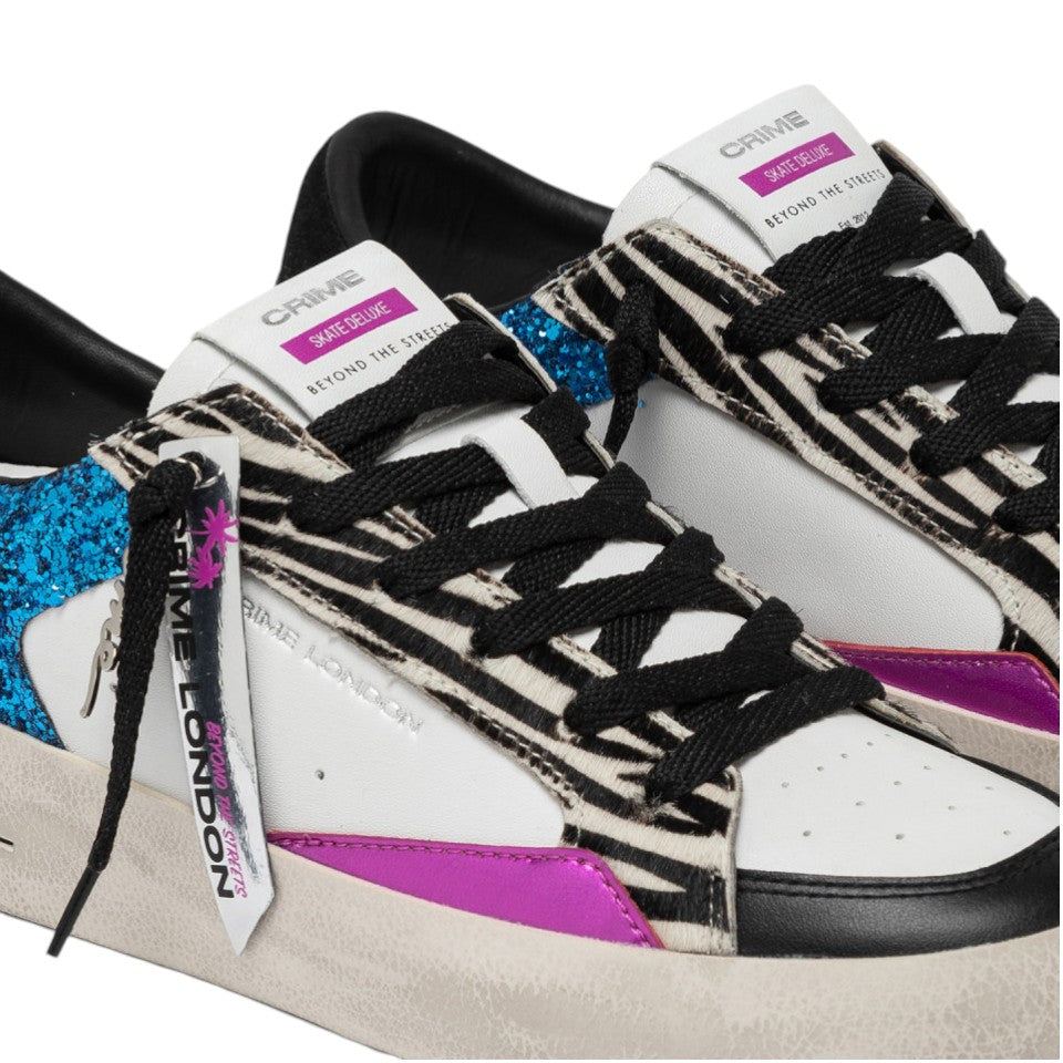 La Sneakers firmata Crime London, realizzata con tomaia in pelle bianca con glitter blu e pelle di vitello stampa zebra, dettagli in pelle laminata viola è caratterizzata da linguetta sul tallone in pelle scamosciata nera e da lnguetta in pelle bianca con etichetta in tessuto logato. Inoltre, dispone di lacci neri con ciondolo CRIME e di etichetta singola con effetto specchio argentato.
