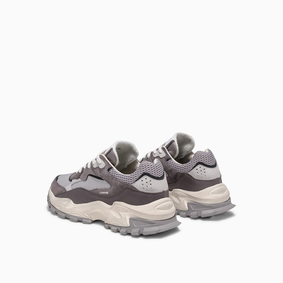 Sneaker runner di Crime London con tomaia patchwork antracite con mix di pelle, suede, mesh e reflex in tono, linguetta logata con stampa Crime, spazzolato effetto vintage e con lacci off white in cotone, fodera in pelle e tessuto.