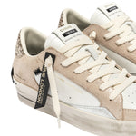 La Sneakers firmata Crime London, realizzata con tomaia color carne con dettagli in pelle laminata argento è caratterizzata da linguetta sul tallone con glitter platino e linguetta in pelle bianca con etichetta in pelle con logo. Dispone di toppa in pelle nera sul retro e lacci di marshmallow.