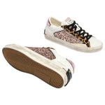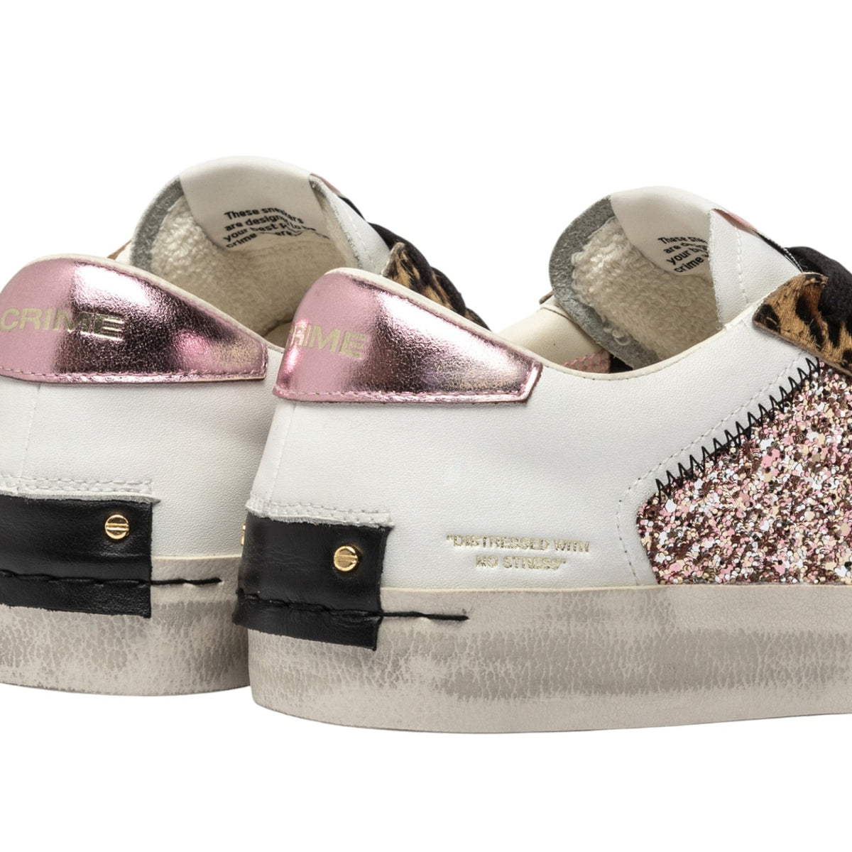 La Sneakers firmata Crime London, realizzata con tomaia in pelle bianco con glitter multicolor e inserti in cavallino leopardato è caratterizzata da talloncino in lamina rosa e linguetta in pelle bianco con label logata in tessuto. Presenta patch in pelle nera sul retro e lacci neri in cotone.