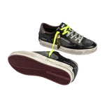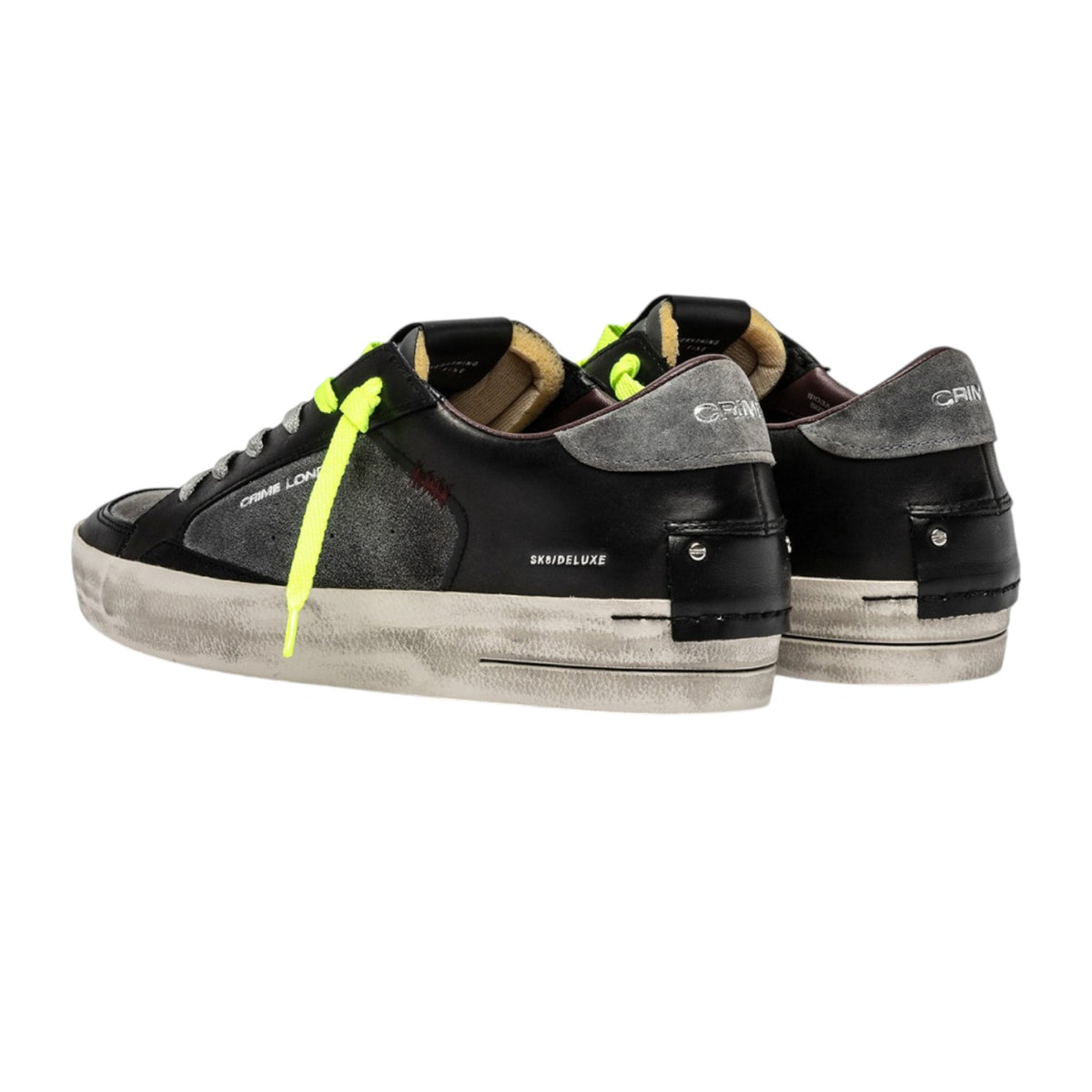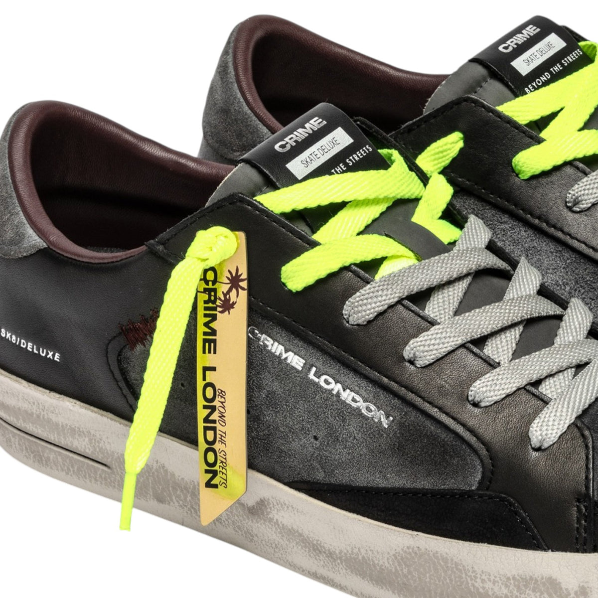 La Sneakers firmata Crime London, realizzata con tomaia in pelle nera, dettagli in suede antracite è caratterizzata da linguetta sul tallone in camoscio antracite e da toppa in pelle nera sul retro. Dispone di lacci grigio chiaro e doppio pizzo giallo fluo.
