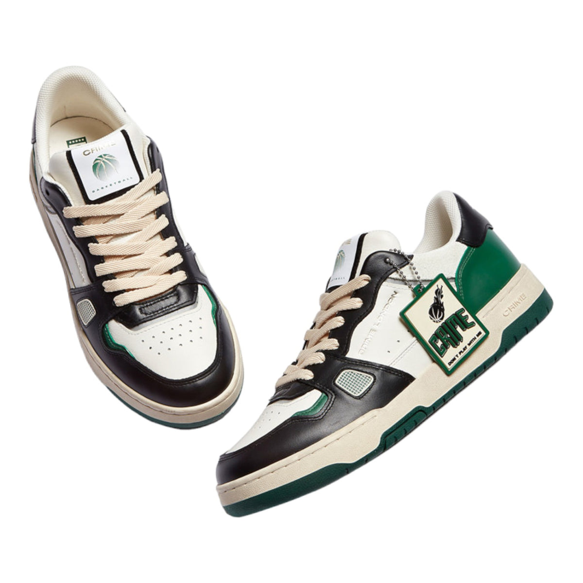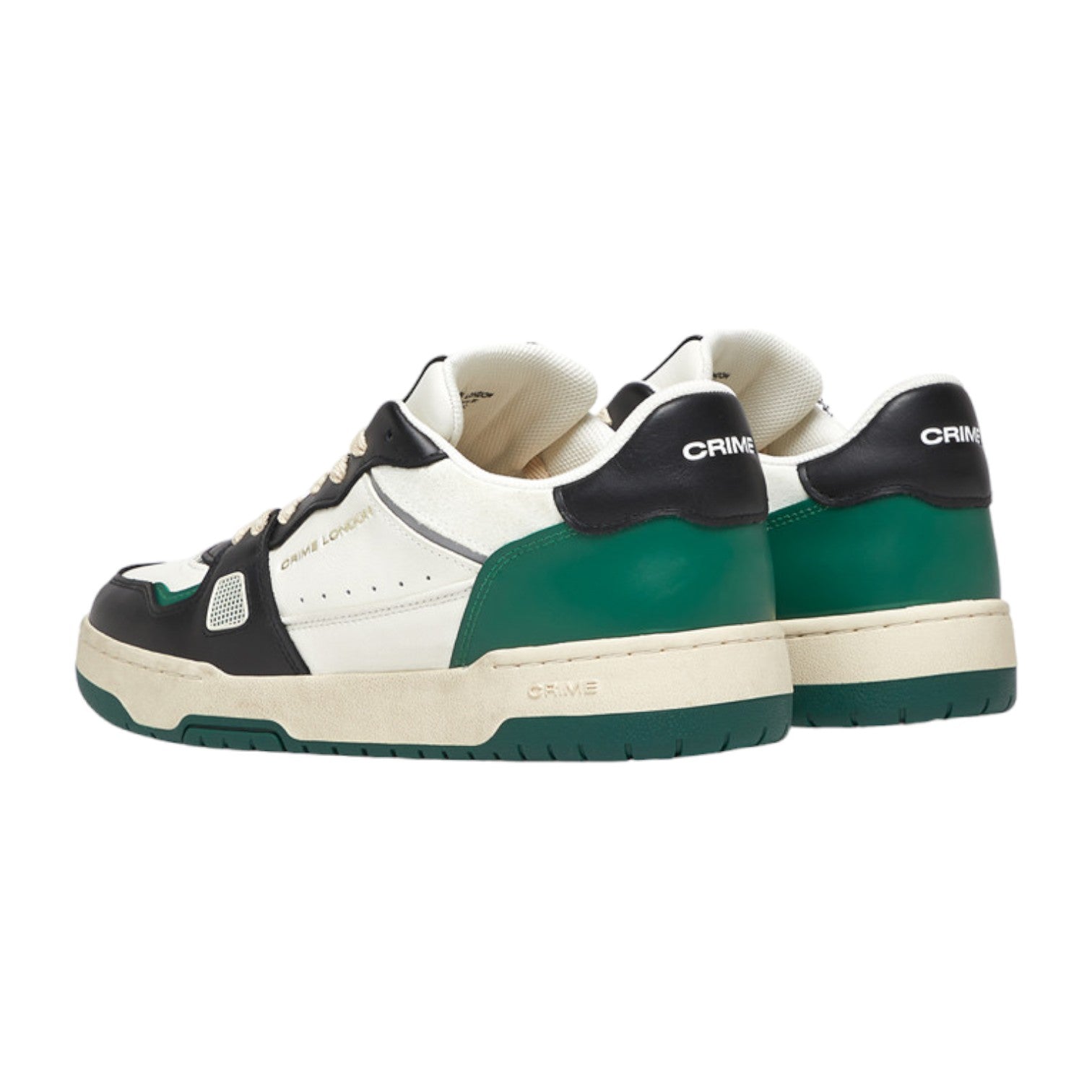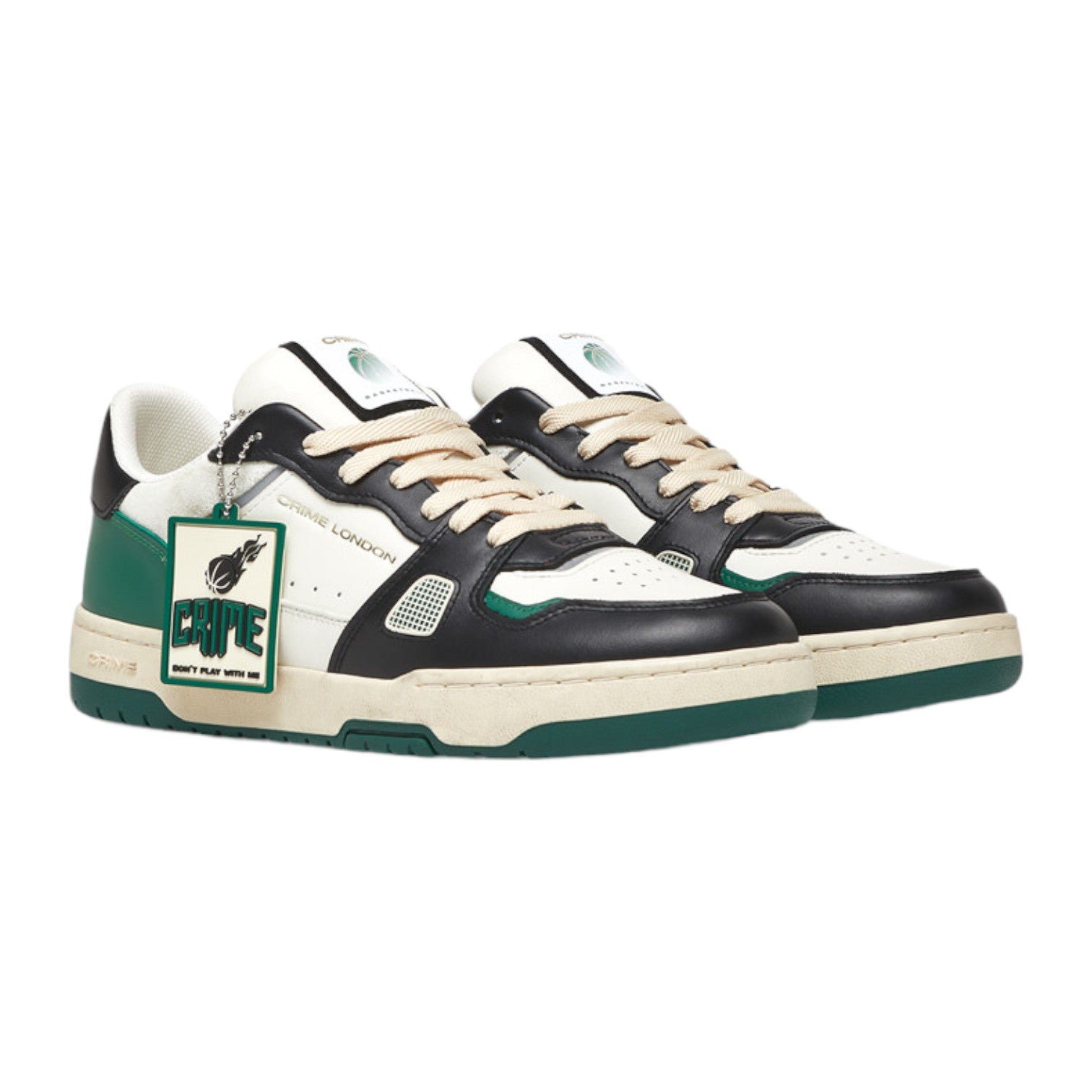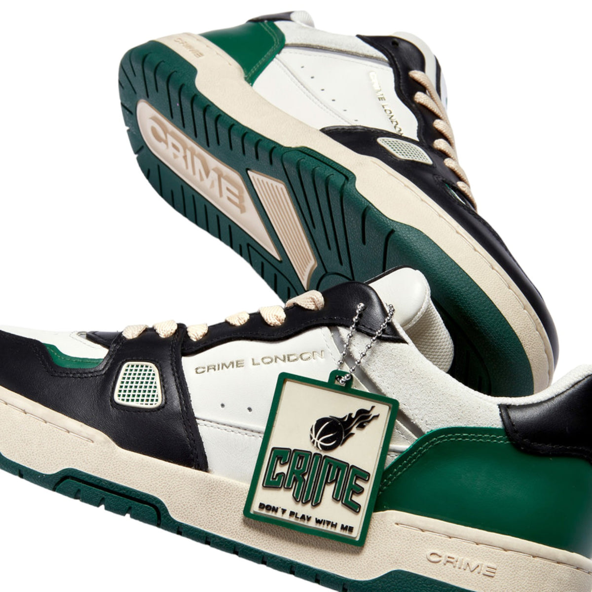 La Sneakers firmata Crime London, realizzata in tomaia in pelle bianca con tallone nero, profili neri e verdi, dettagli catarifrangenti è caratterizzata da inserti in gomma laterali traforati off white e verdi e da una linguetta con label in pelle bianca logata e grafica basketball stampata, inoltre presenta un tag basketball a rilievo logato.