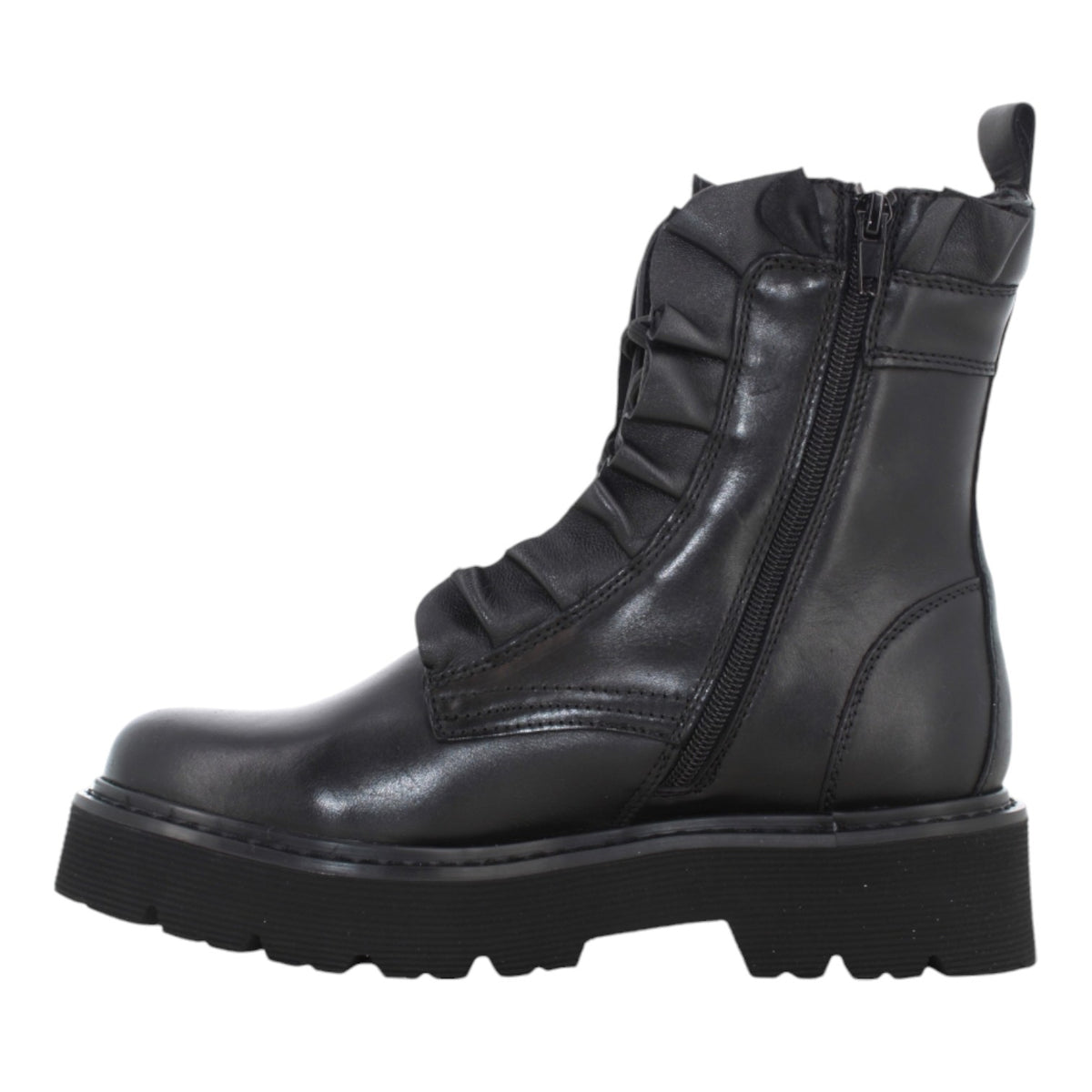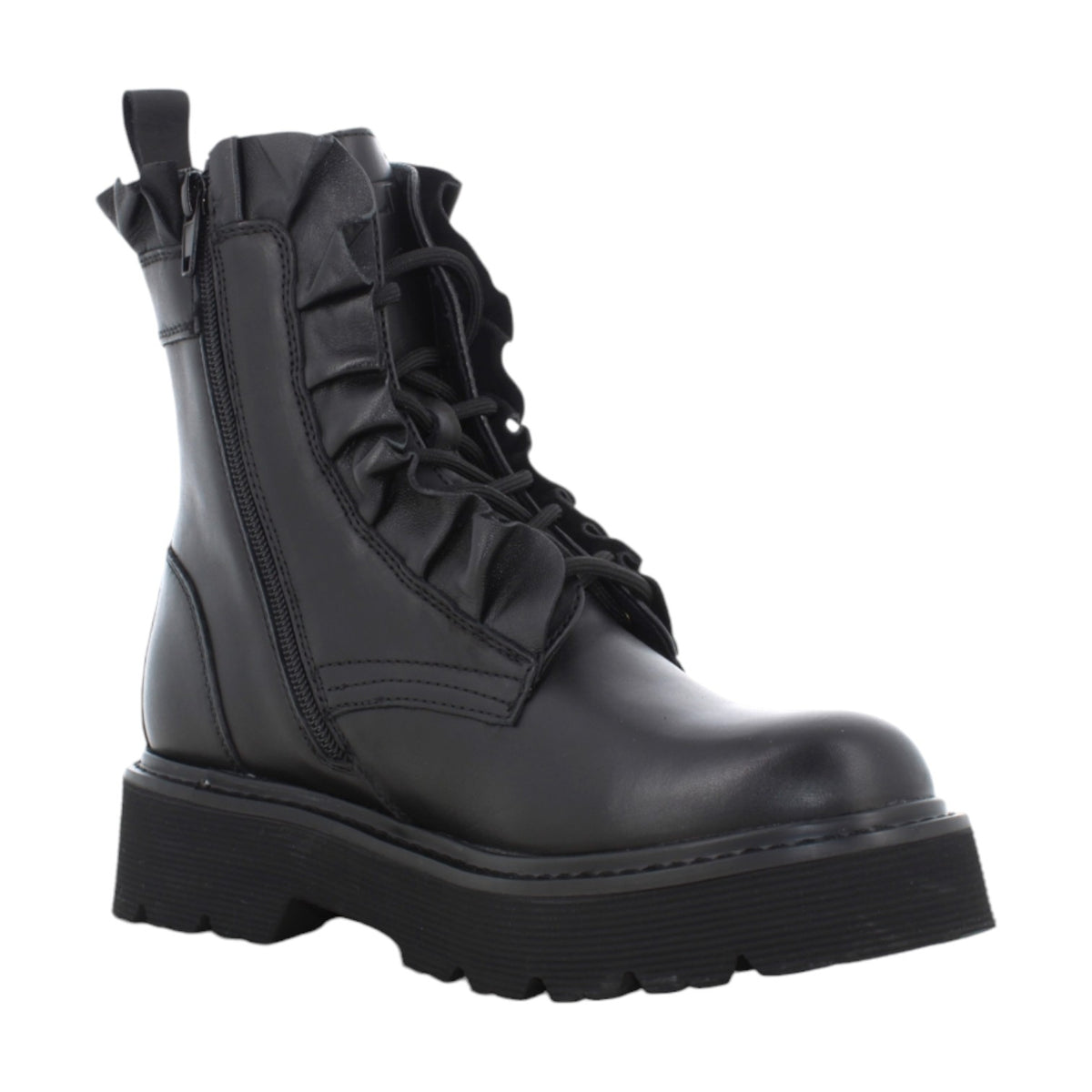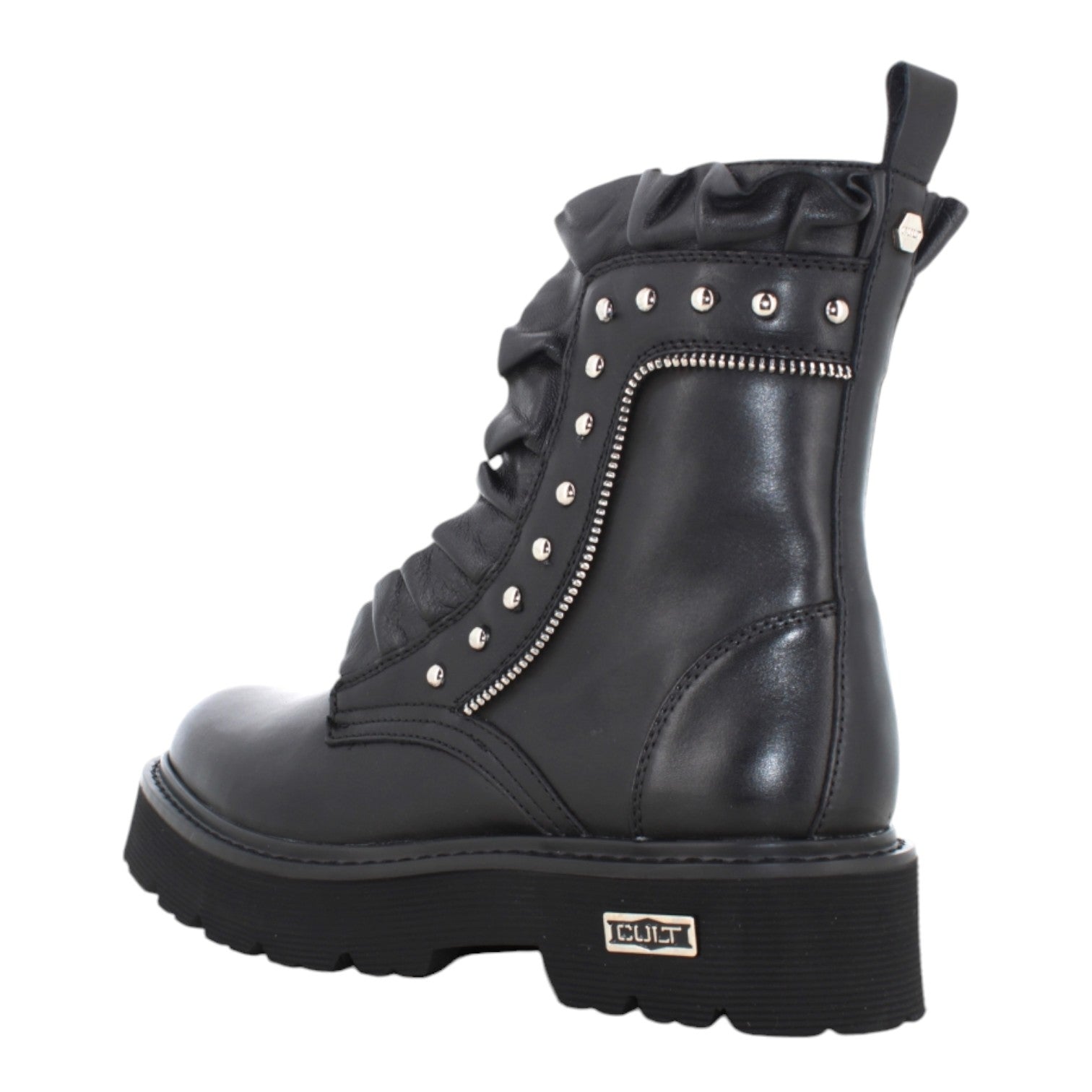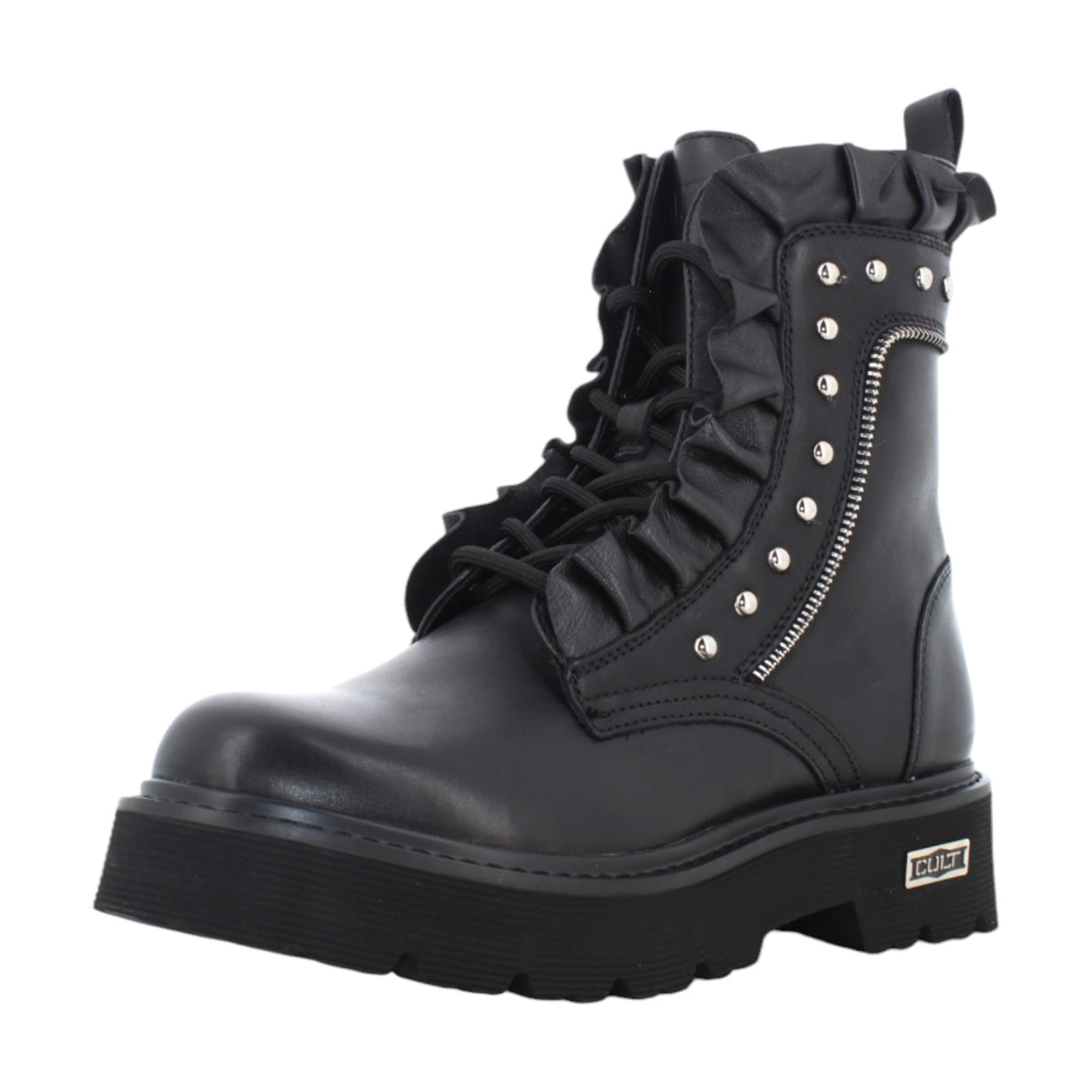 L'Anfibio firmato Cult, realizzato in pelle dona un tocco rock al tuo look con lacci e borchie, mentre la chiusura con cerniera laterale lo rende facile da indossare. Presenta una tomaia arricchita con rouches e il sottopiede imbottito garantiscono comfort e stile, ideale per un look audace e alla moda.