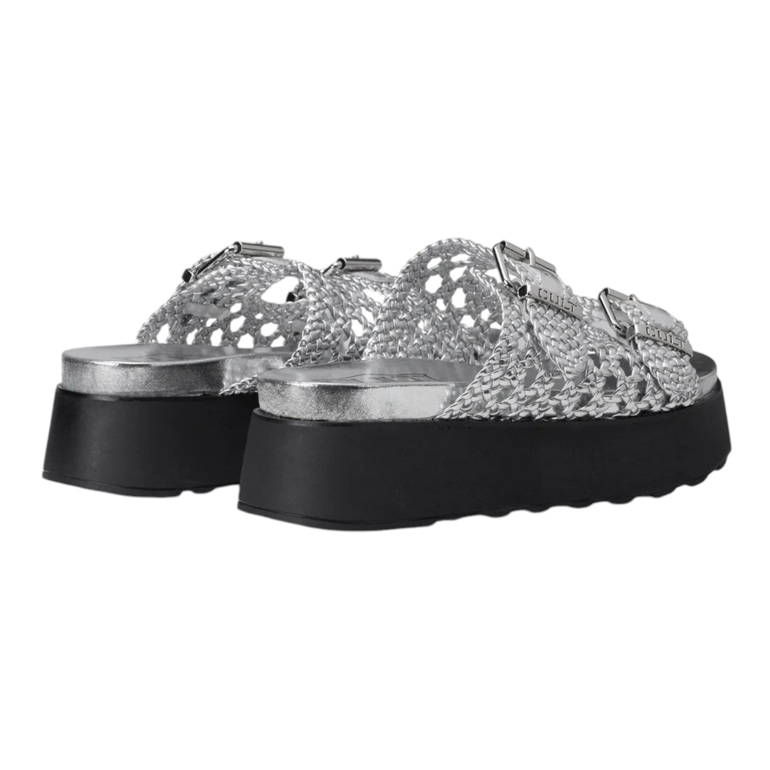 La Ciabatta firmata Cult, realizzata in ecopelle è caratterizzata da due fasce in pelle color argento con lavorazione intrecciata impreziosite da fibbie in metallo con logo Cult inciso e suola platform li rende perfettamente abbinabili a ogni outfit, per un look davvero glam-rock.