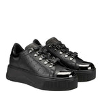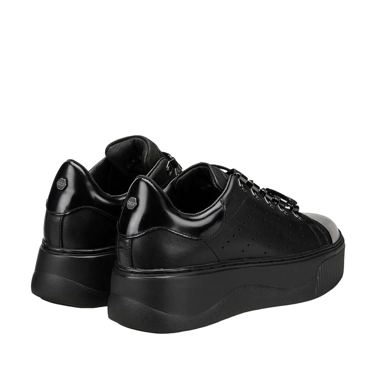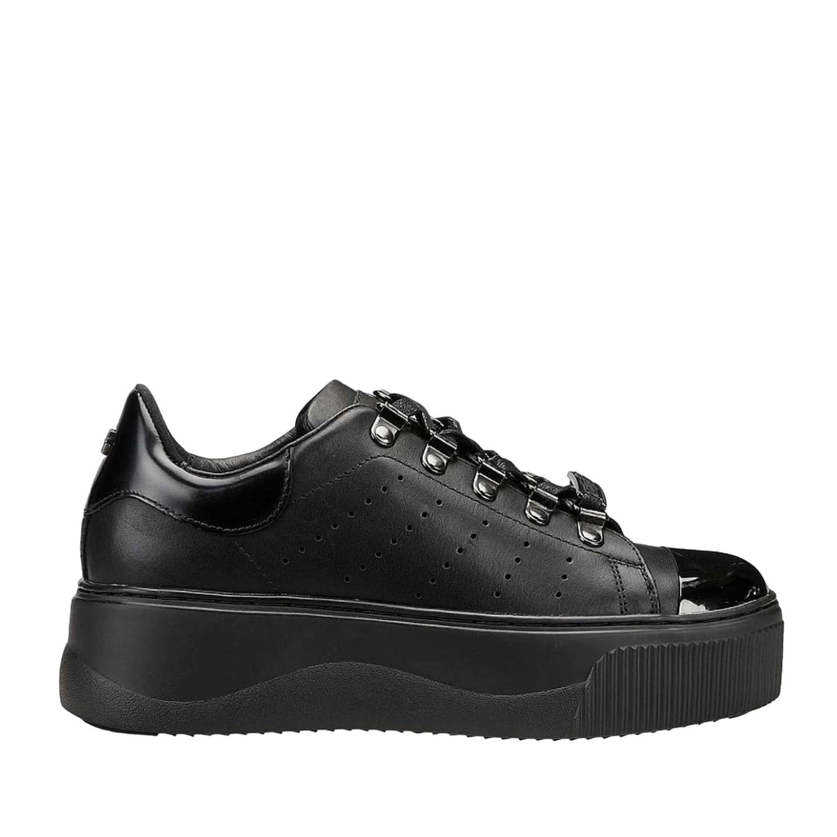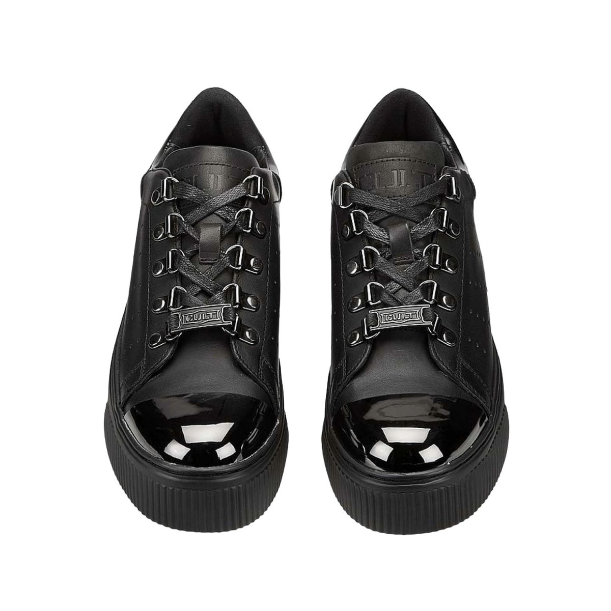 La Sneakers firmata Cult, realizzata in pelle è caratterizzata da una punta in metallo sul davanti e da interno e sottopiede estraibile foderati in pelle con suola plaform alta 5cm, in gomma.