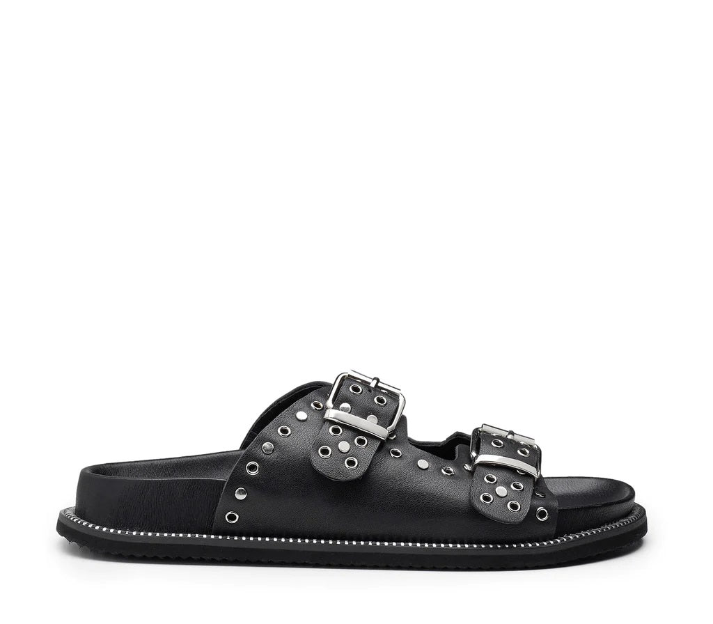 La Ciabatta firmata Cult è realizzata in pelle nera con doppia fibbia e caratterizzata da borchie piatte e occhielli metallici, per un look grintoso ed originale.