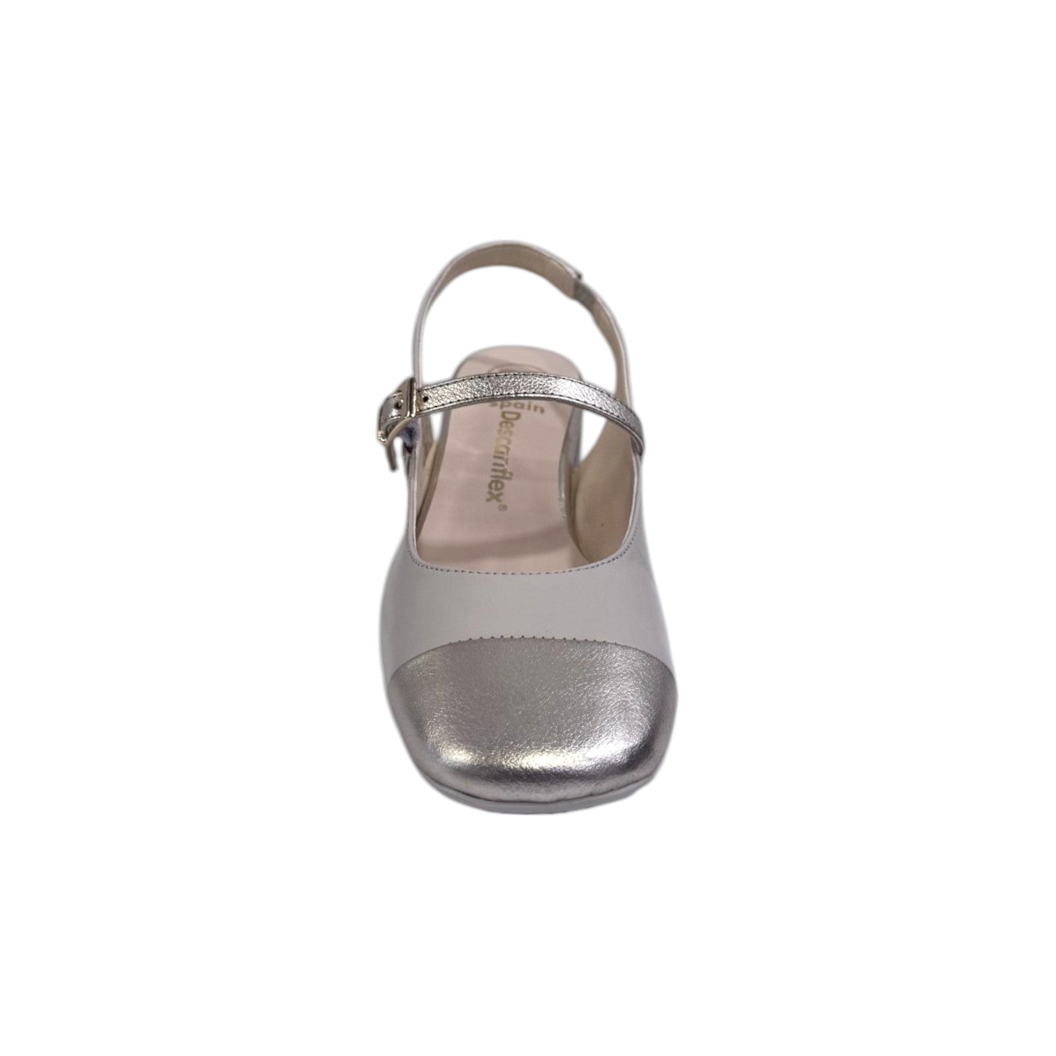 La Chanelle firmata Descanflex, nella variante ecru realizzata in pelle modello a punta quadra laminata platino dal design molto moderno ed elegante è caratterizzata da un cinturino con fibbia alla caviglia che permette un migliore sostegno e comfort. Il tacco largo alto 7cm è molto comodo permettendo di indossarli per ore, con un fondo gomma ultra flessibile.