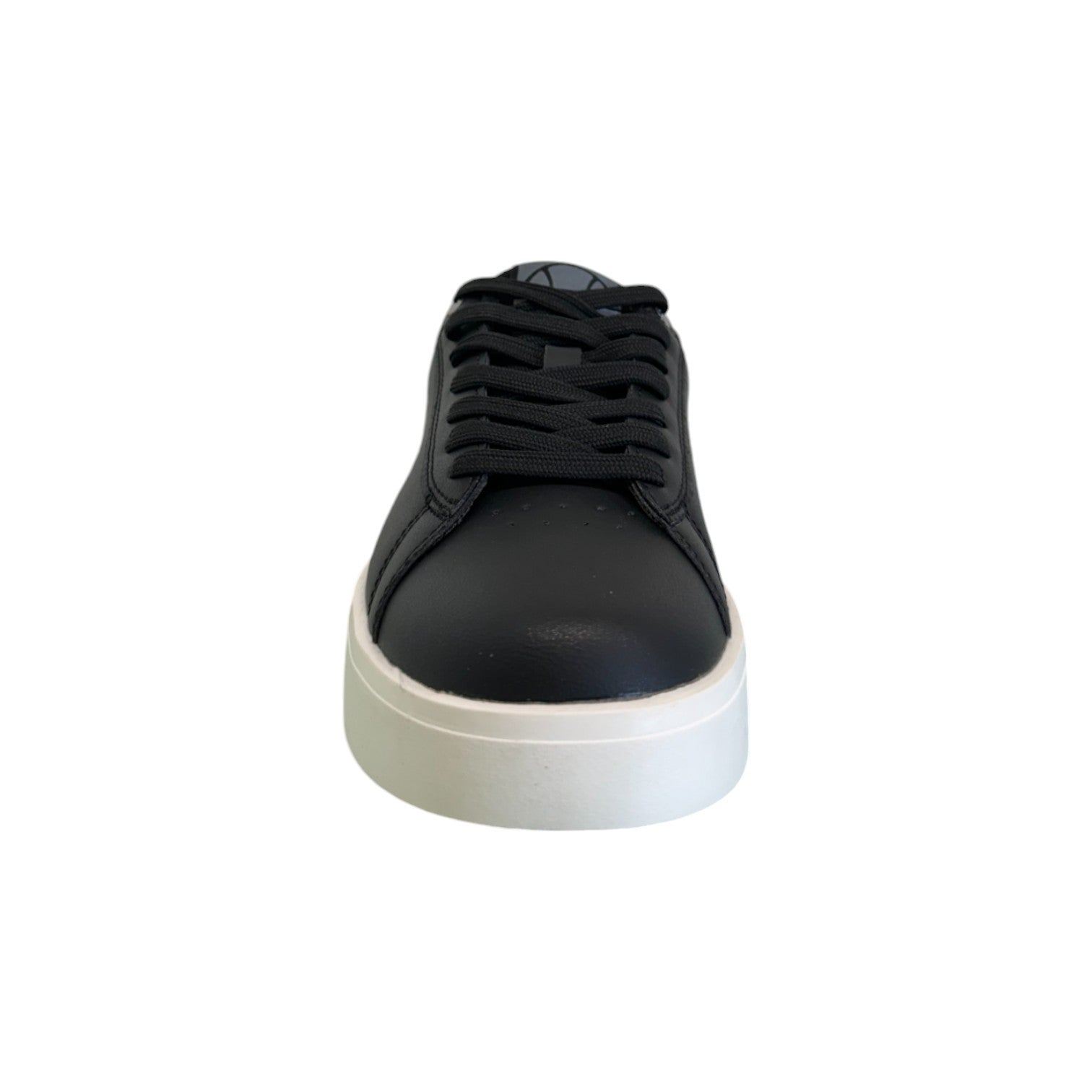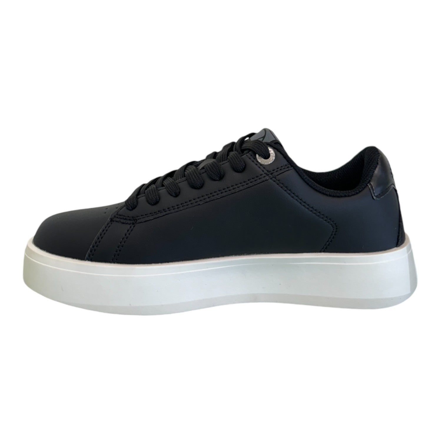 La Sneakers firmata Ellesse, realizzata in ecopelle nera è caratterizzata da scritta logo laterale, presenta una suola alta 3,6cm con fondo in gomma bianco e un'interno e sottopiede in memory foam estraibile foderati in tessuto.