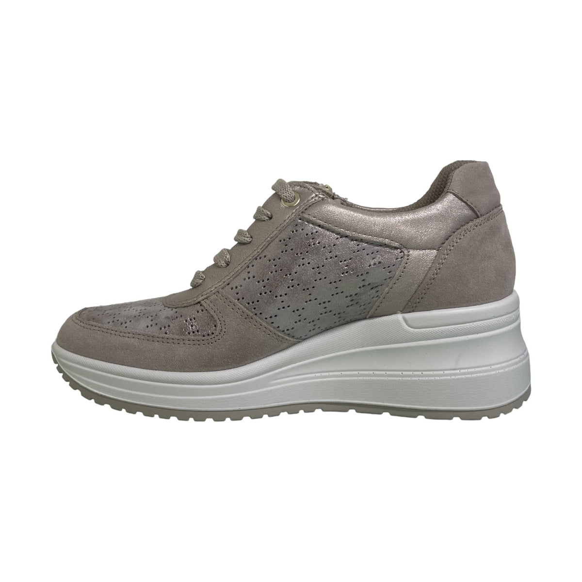 La Sneakers firmata Enval Soft, realizzata in camoscio e pelle effetto perlato brillantinato, presenta una comoda chiusura con lacci e zip laterale, e un plantare in pelle estraibile memory foam. La zeppa interna è molto leggera e regala centimetri alla figura senza affaticare la camminata.