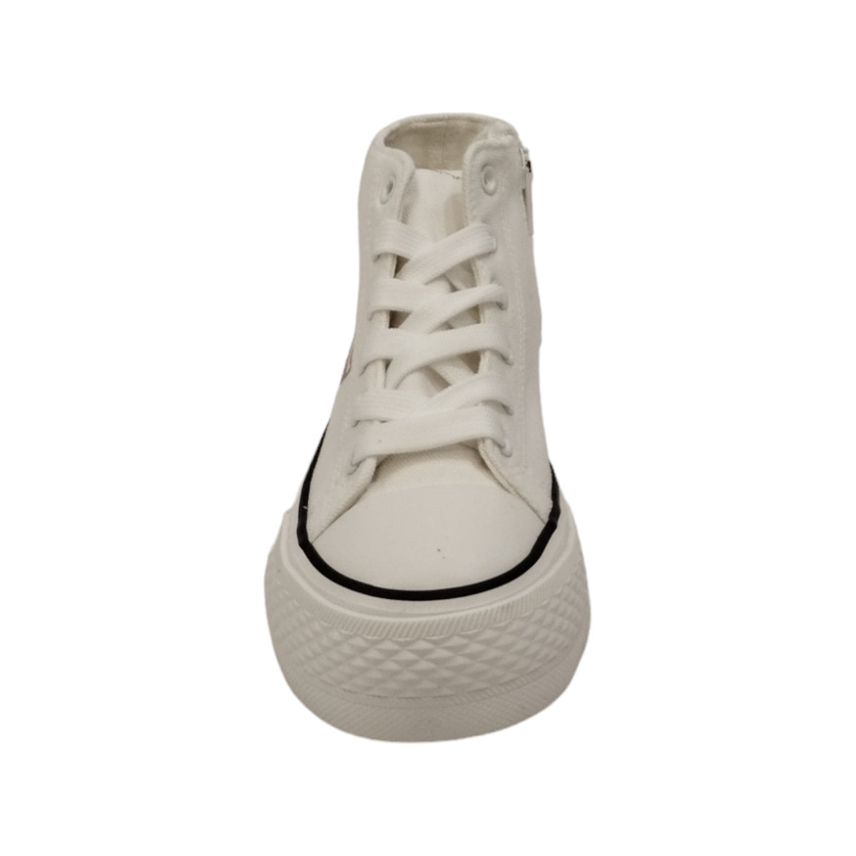 La Sneakers firmata Fornarina, realizzata in morbido tessuto bianco è decorata dalla stampa con coroncina fucsia glitterata che arricchisce la linea classica donandogli un tocco chic. Un design semplice ed efficace con la punta in gomma, che le rende perfette per la scuola o per il tempo libero.