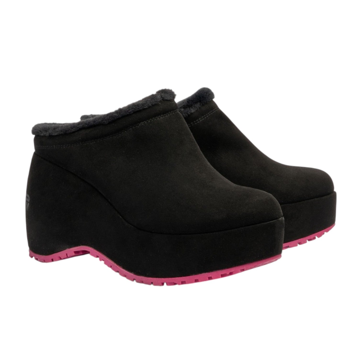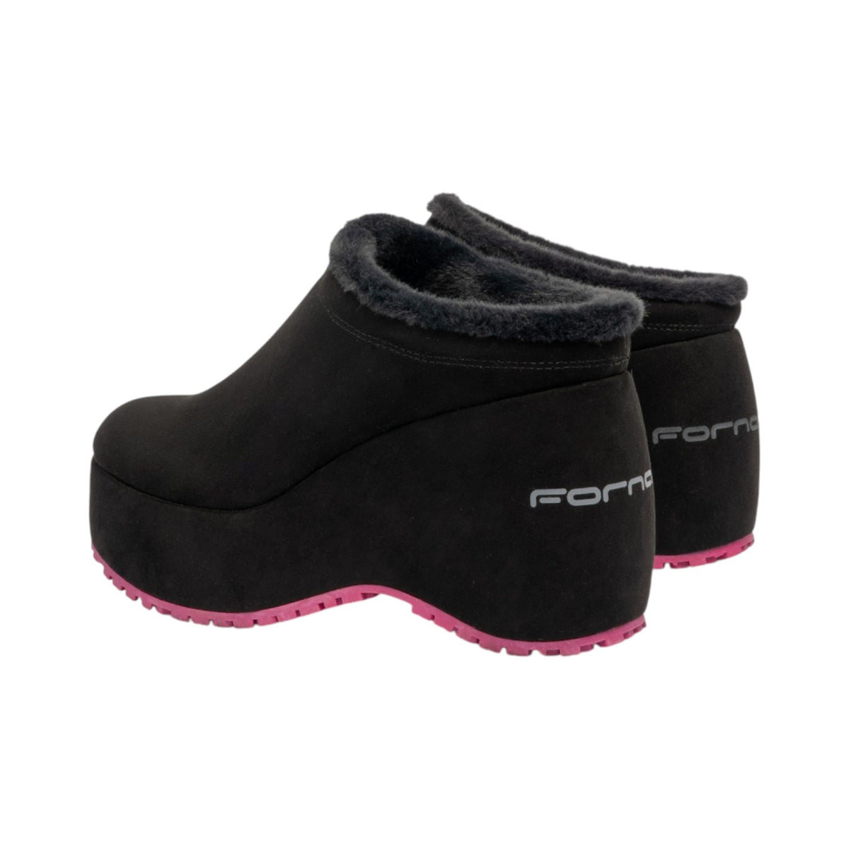 Il Sabot firmato Fornarina, realizzato in morbido camoscio è caratterizzato da comoda zeppa alta 9,5cm e da caldo interno in eco-pelliccia e suola pink Fornarina sono un must-have di questa stagione.