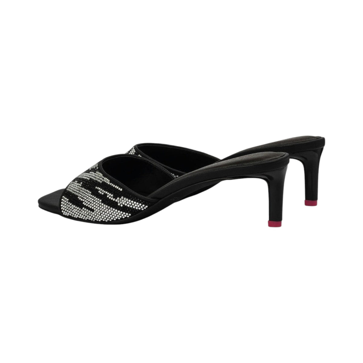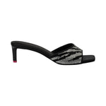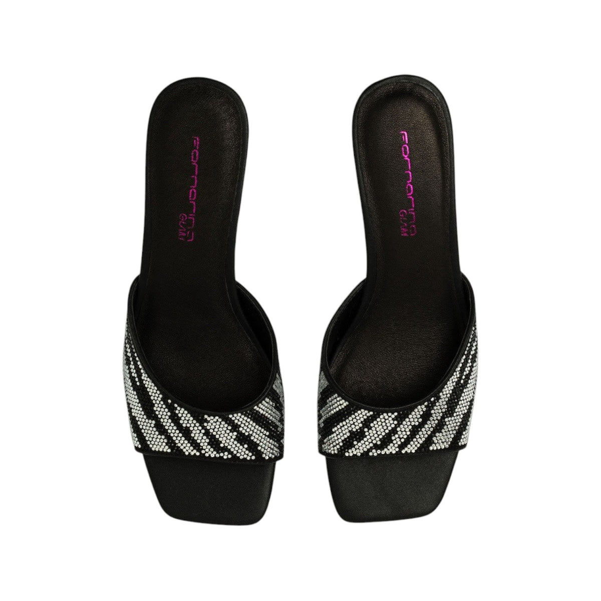 Lo Scalzato firmato Fornarina della linea Kelly, è il mules perfetto per accompagnarti nelle serate estive di festa. Total black, kitten heels, sottotacco fucsia e una cascata di strass argento e neri che sormontano la tomaia.