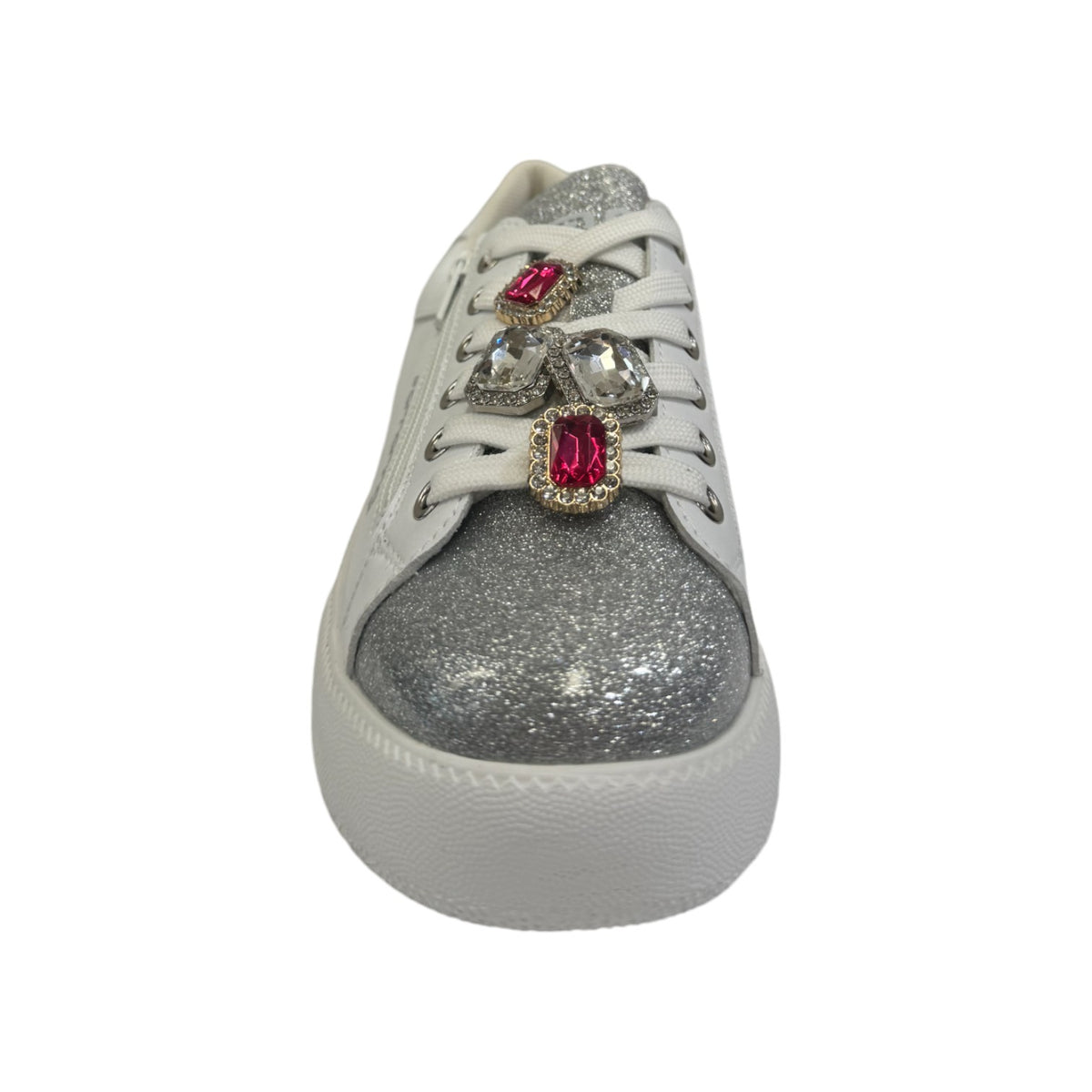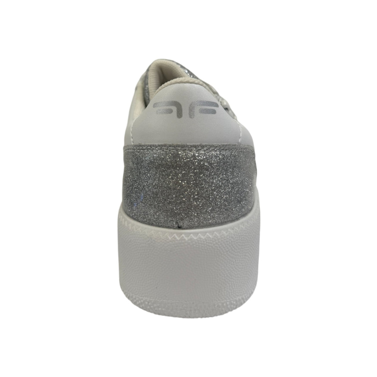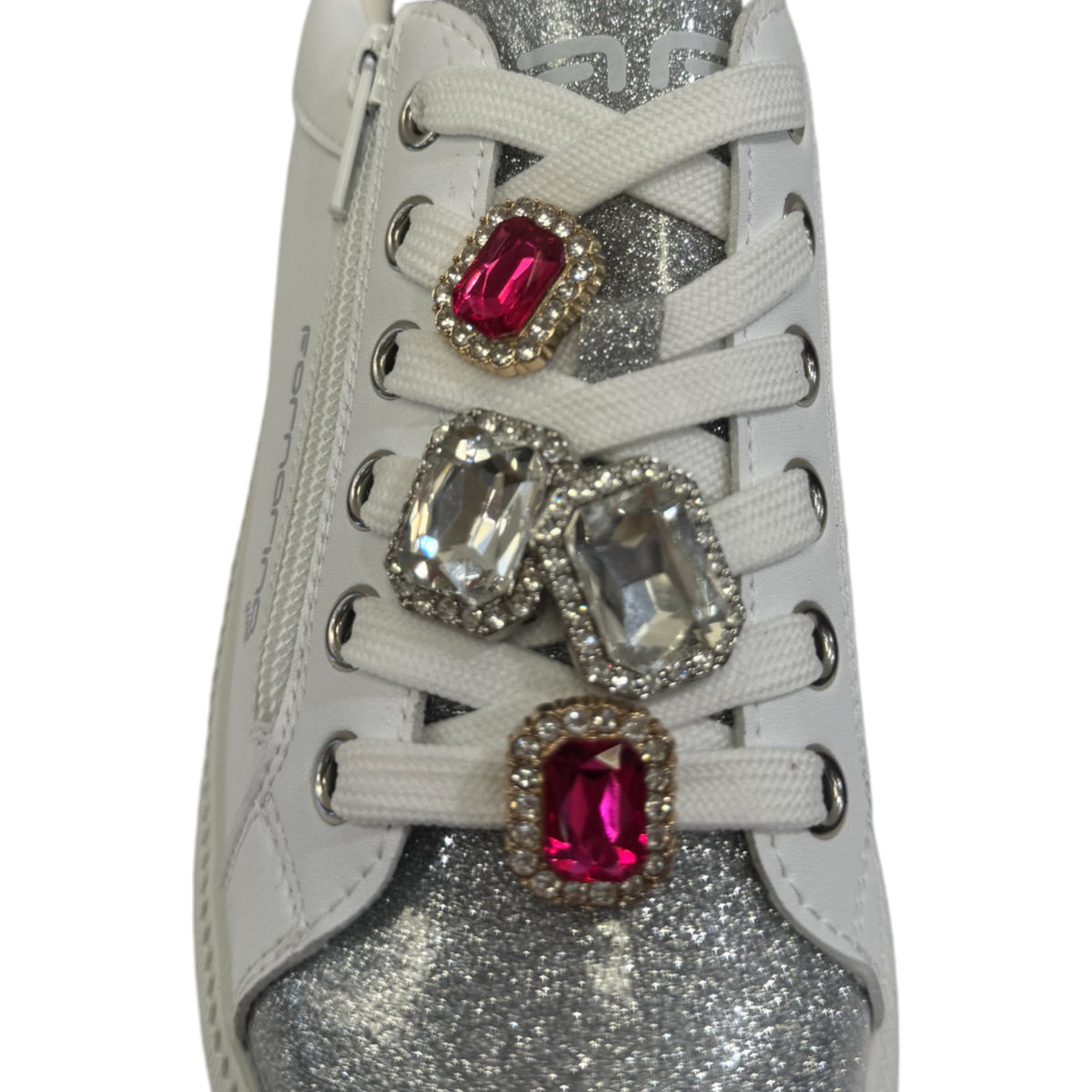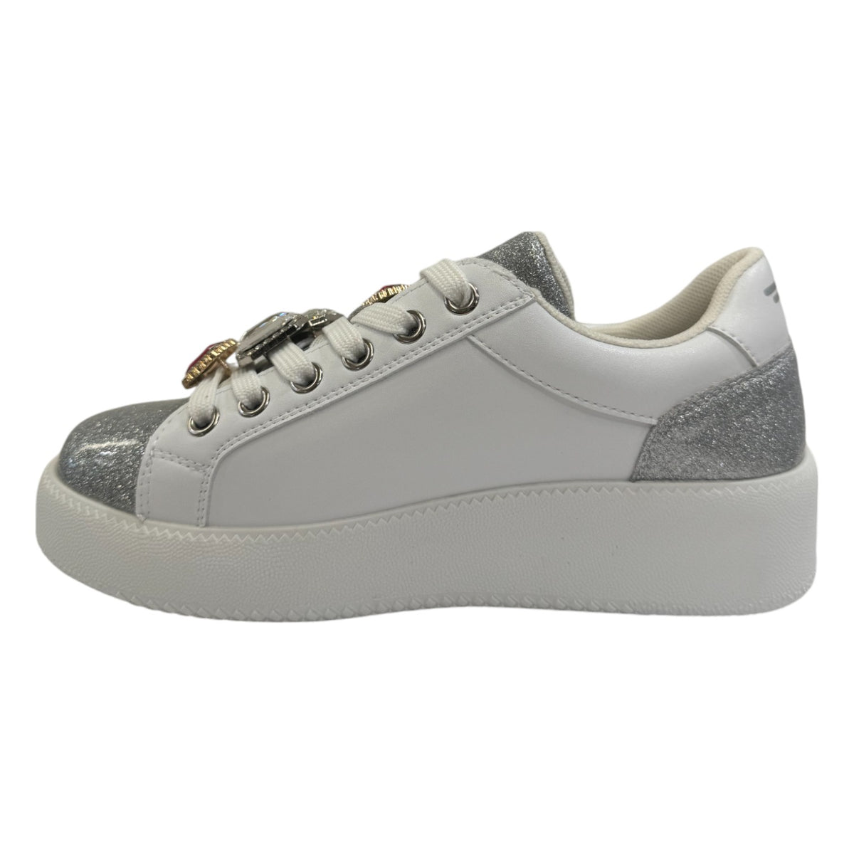 La Sneakers firmata Fornarina, realizzata in ecopelle bianca è caratterizzata da accessori gioiello removibili posizionati sui lacci e da glitter argento con scritta logo sempre argento sia laterale e sul talloncino, l'interno foderato in tessuto con sottopiede in pelle estraibile.