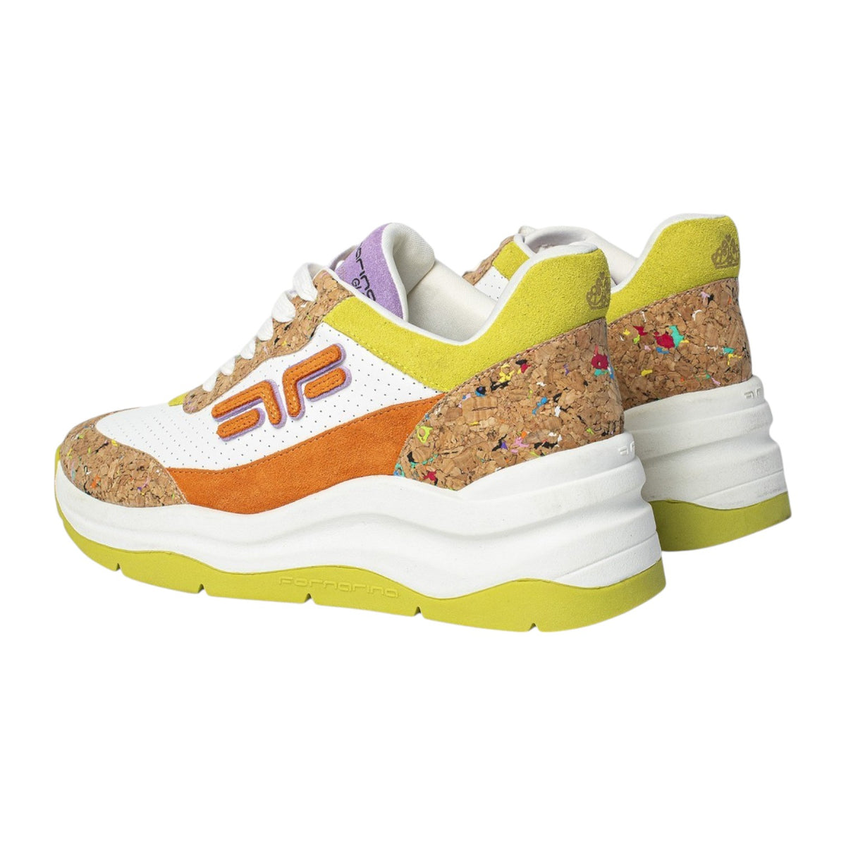 La Sneakers firmata Fornarina, realizzata in pelle e camoscio il mix di colori vivaci è esaltato dalla combinazione di materiali tra cui spiccano gli inserti in simil sughero. Presenta un fondo chunky bicolor, con suola giallo limone e dettagli 100% Fornarina come il logo laterale e sulla linguetta.