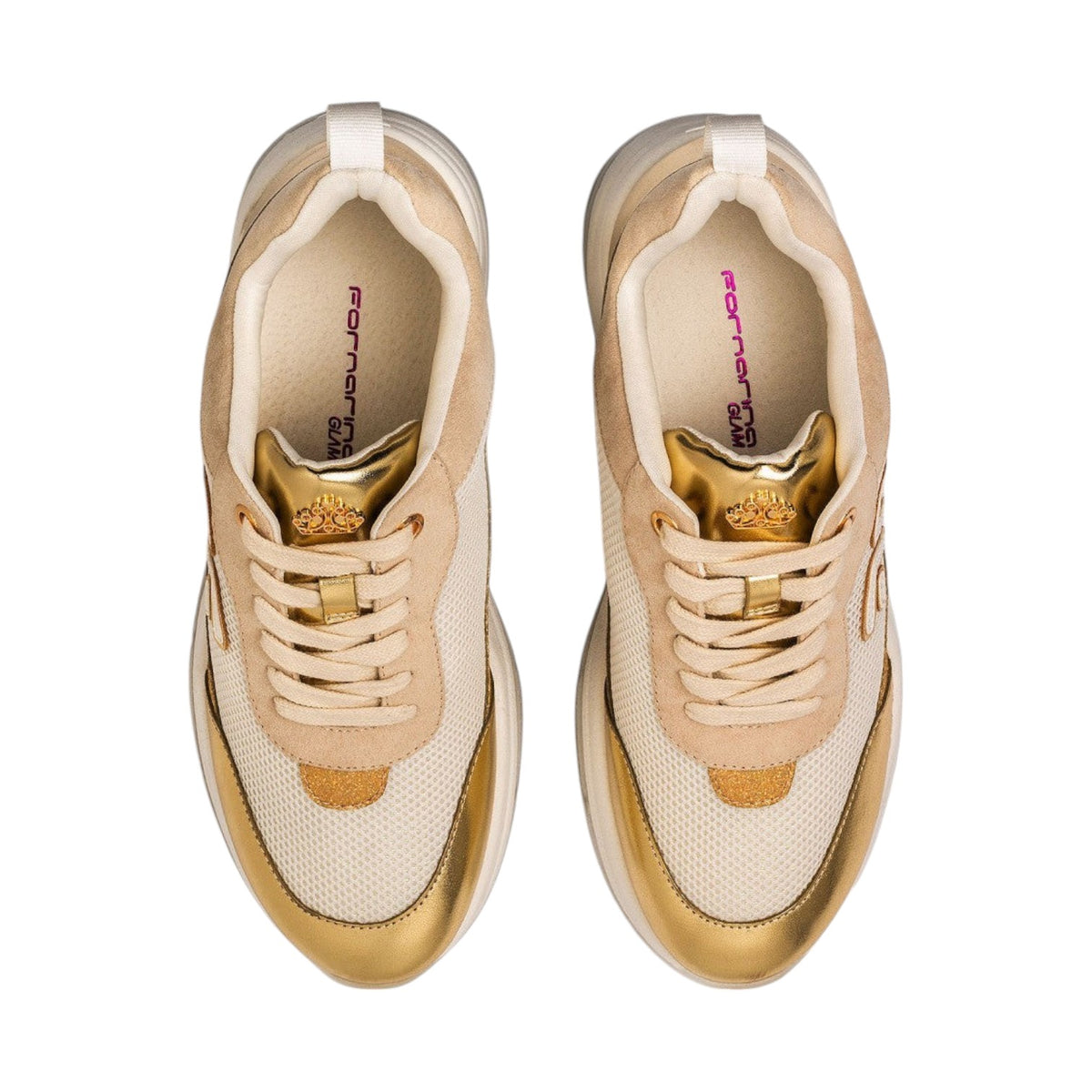 La Sneaker firmata Fornarina della linea Manila, con suola chunky bicolor in gomma che eleva il suo stile casual grazie ad accenti di colori pastello e gold, mix di materiali e dettagli 100% Fornarina come il logo laterale e la corona dorata sulla linguetta.
