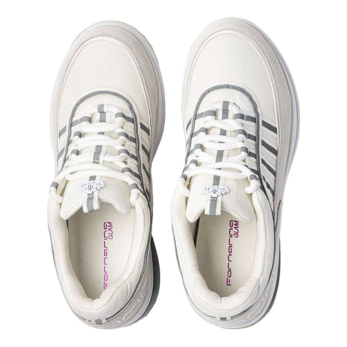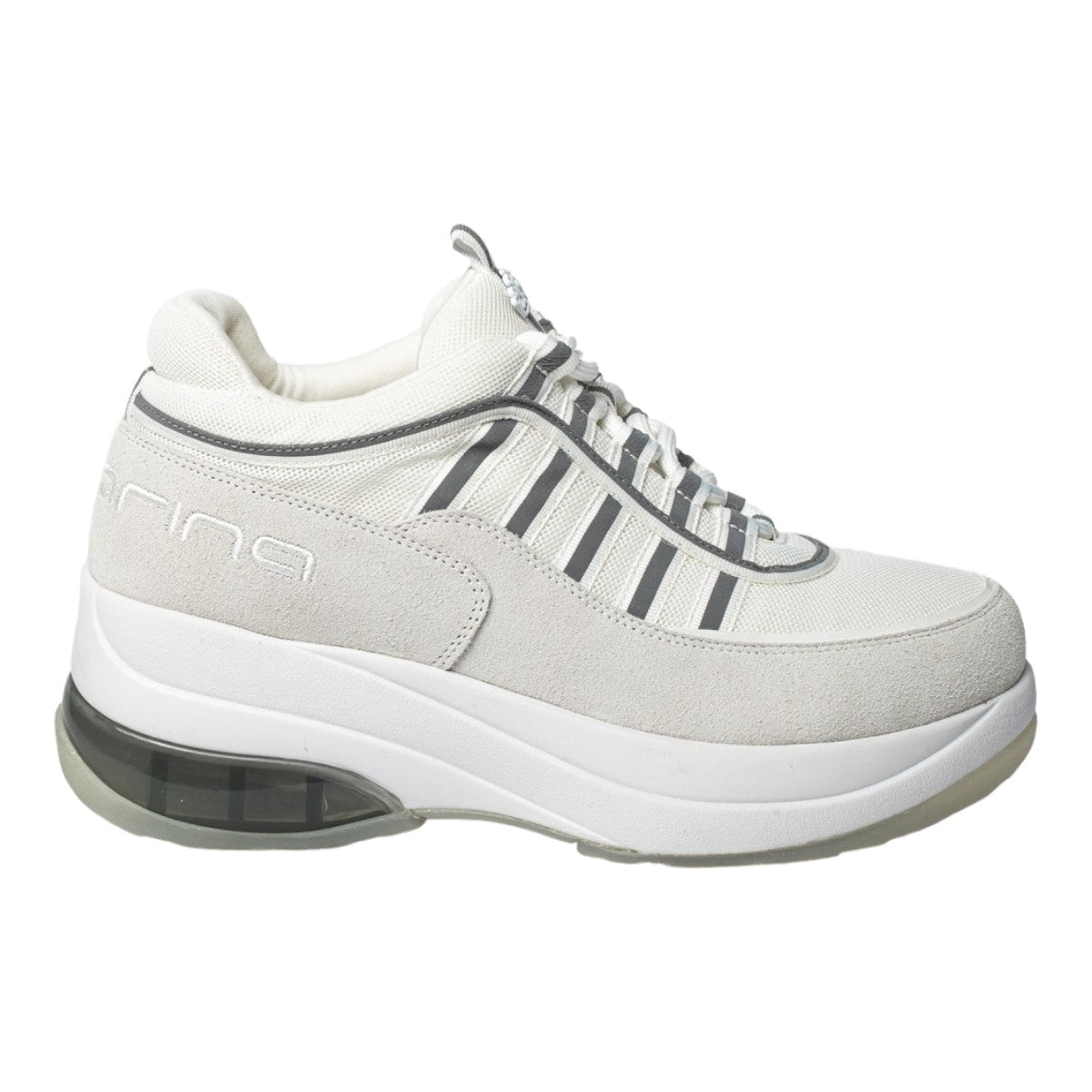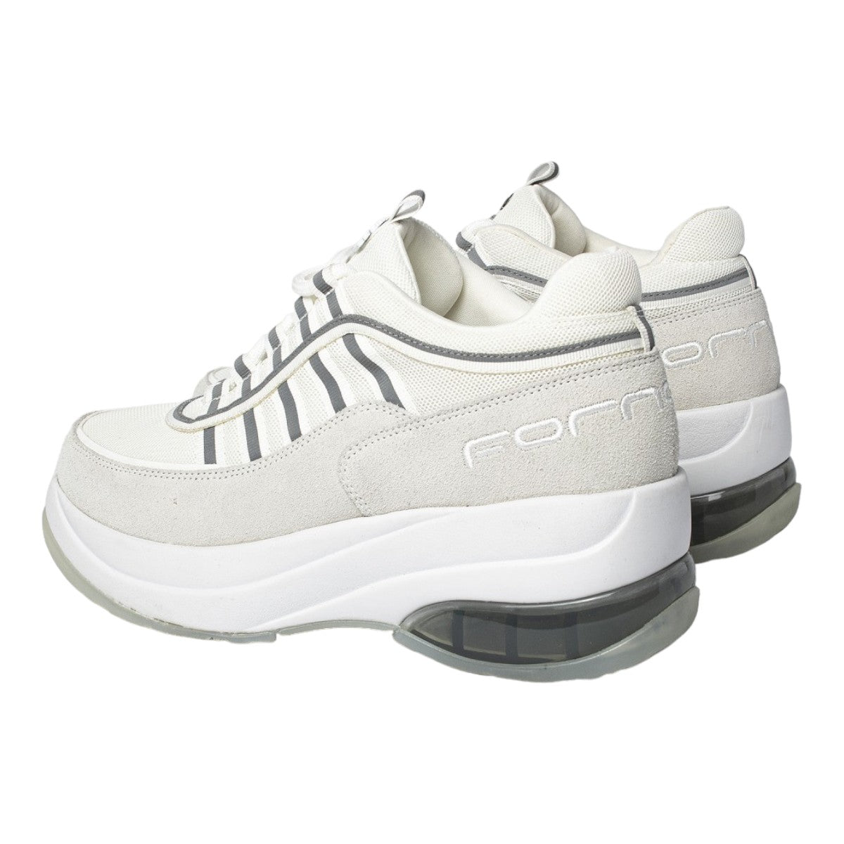 La Sneakers firmata Fornarina, realizzata in casmodcio con inserti in tessuto qui proposta in una versione total white. Indimenticabile platform con inserto trasparente, mix and match di materiali, presenta il logo Fornarina posteriore ton sur ton e corona metallica sulla linguetta.