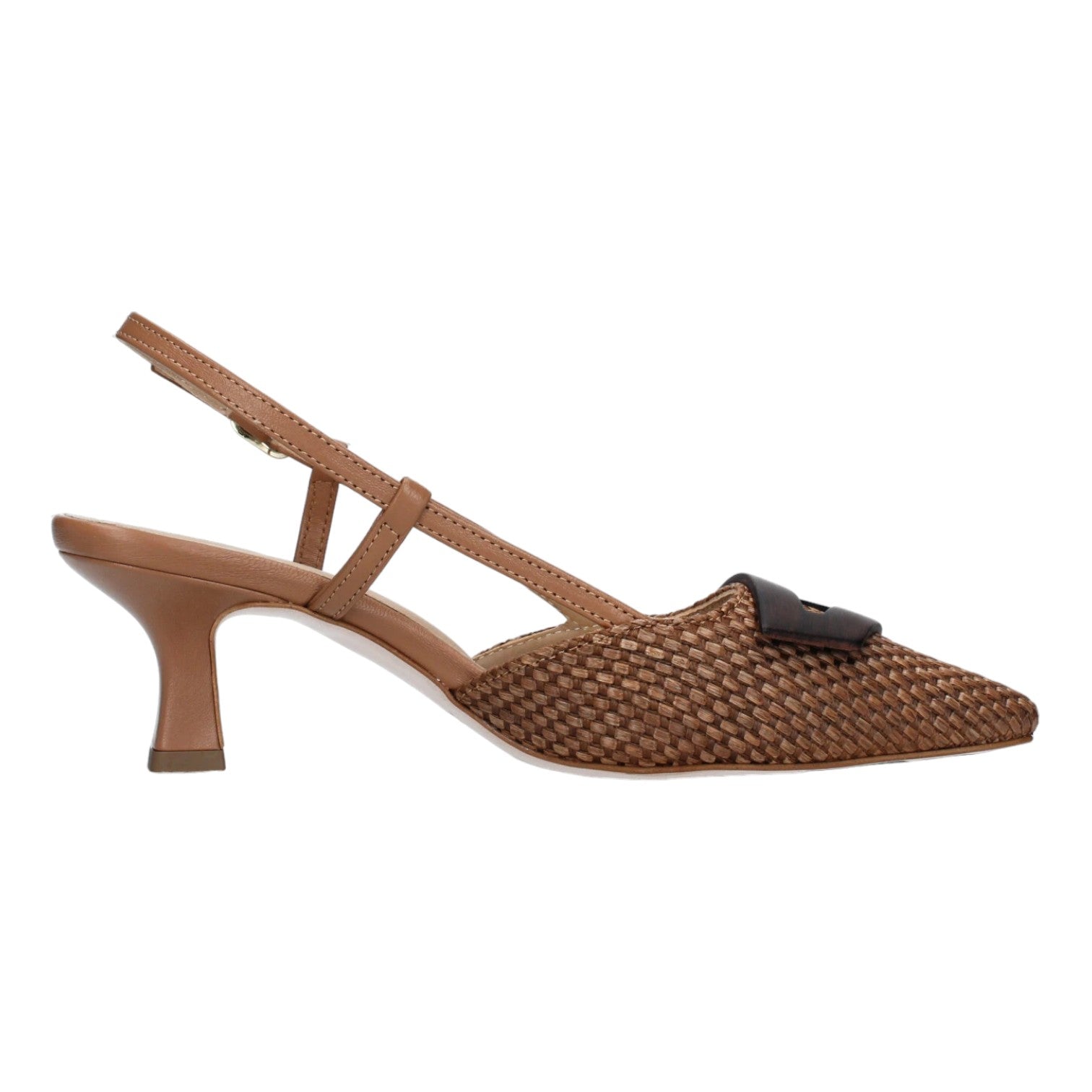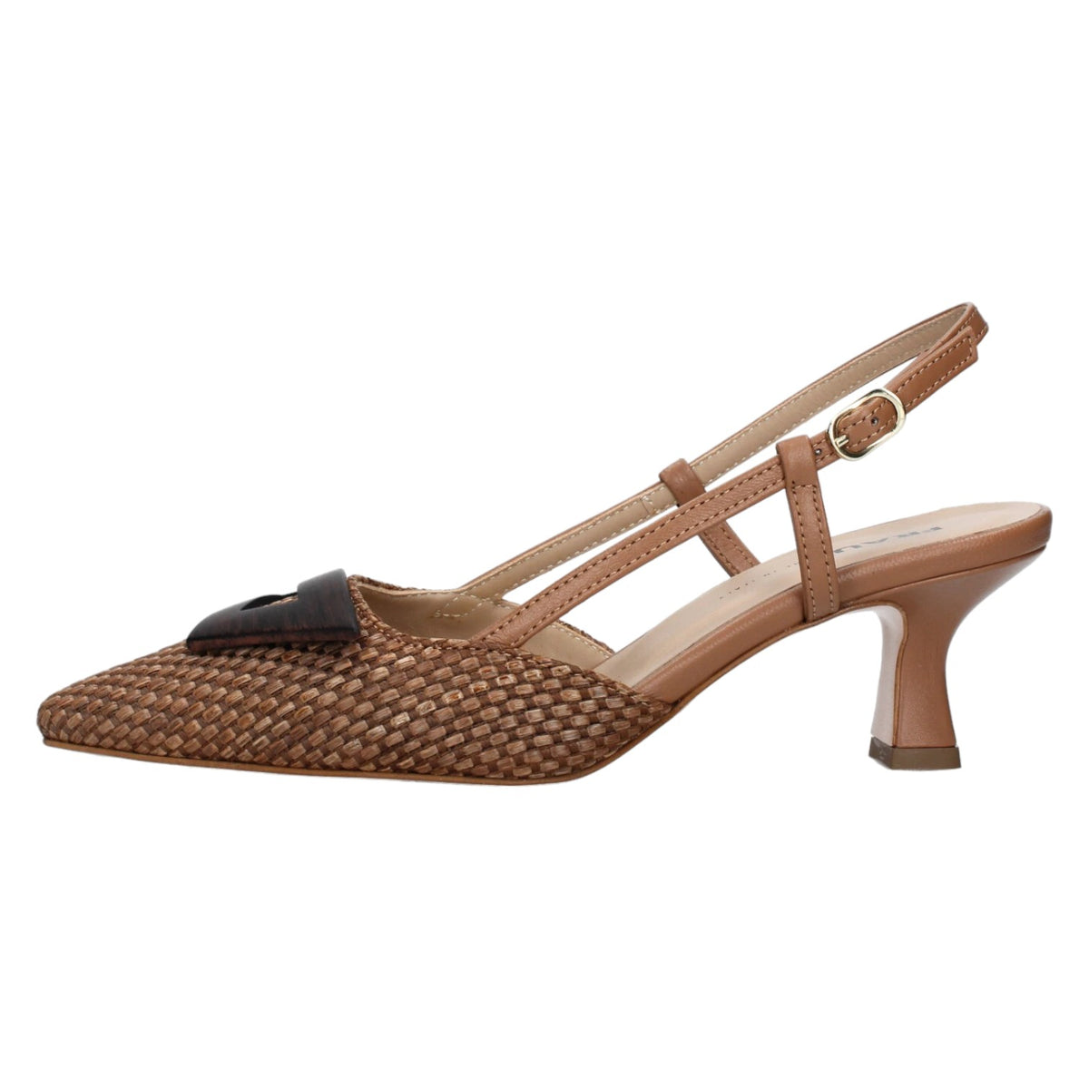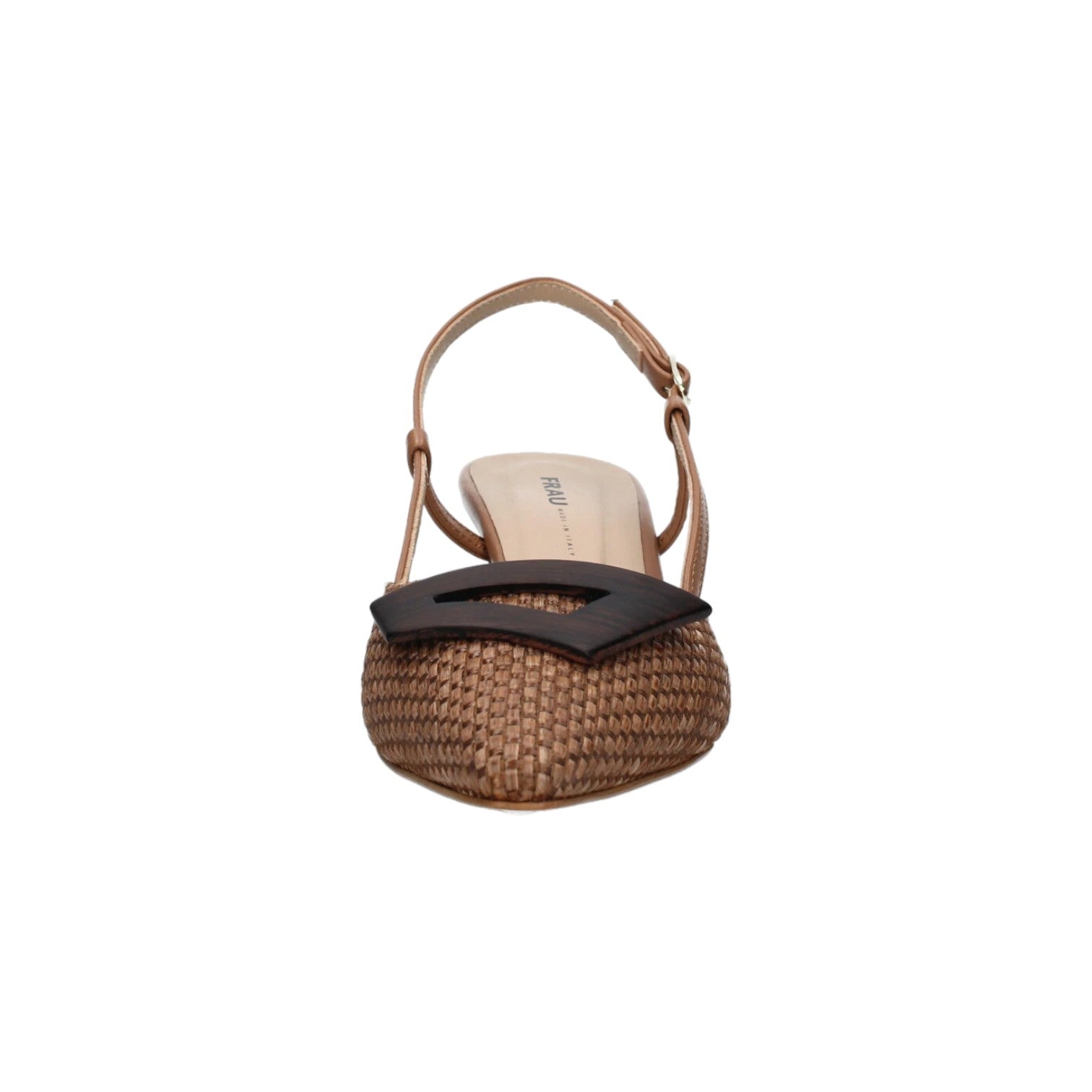 La Chanelle firmata Frau, realizzata con tomaia in raffia intrecciata sulla punta e con accessorio decorativo, è caratterizzato da tacco a rocchetto alto 6cm ed interno rivestito in pelle. Con dettagli curati e un design senza tempo, queste scarpe sono un investimento nel tuo stile personale.