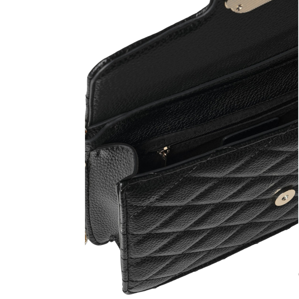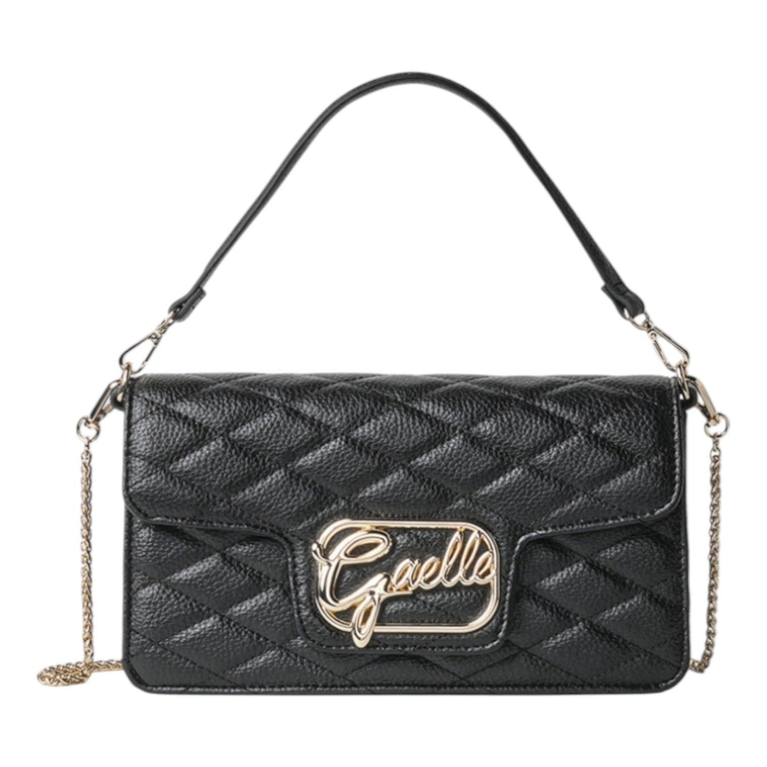 La Borsa a spalla firmata Gaelle Nera con motivo Matelassè, realizzata in ecopelle offre un aspetto sofisticato e una sensazione di morbidezza al tatto, è caratterizzata da logo in metallo color oro, chiusura con patta e bottone. L'interno è foderato in tessuto di cui dispone di tasca con chiusura a zip e targhetta logo.