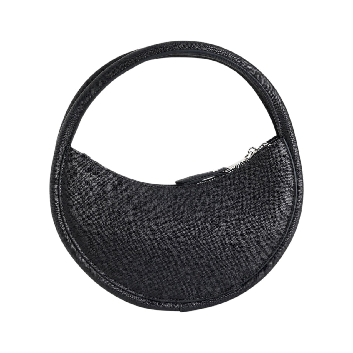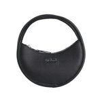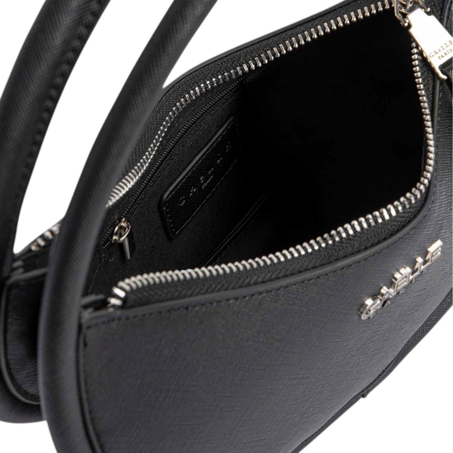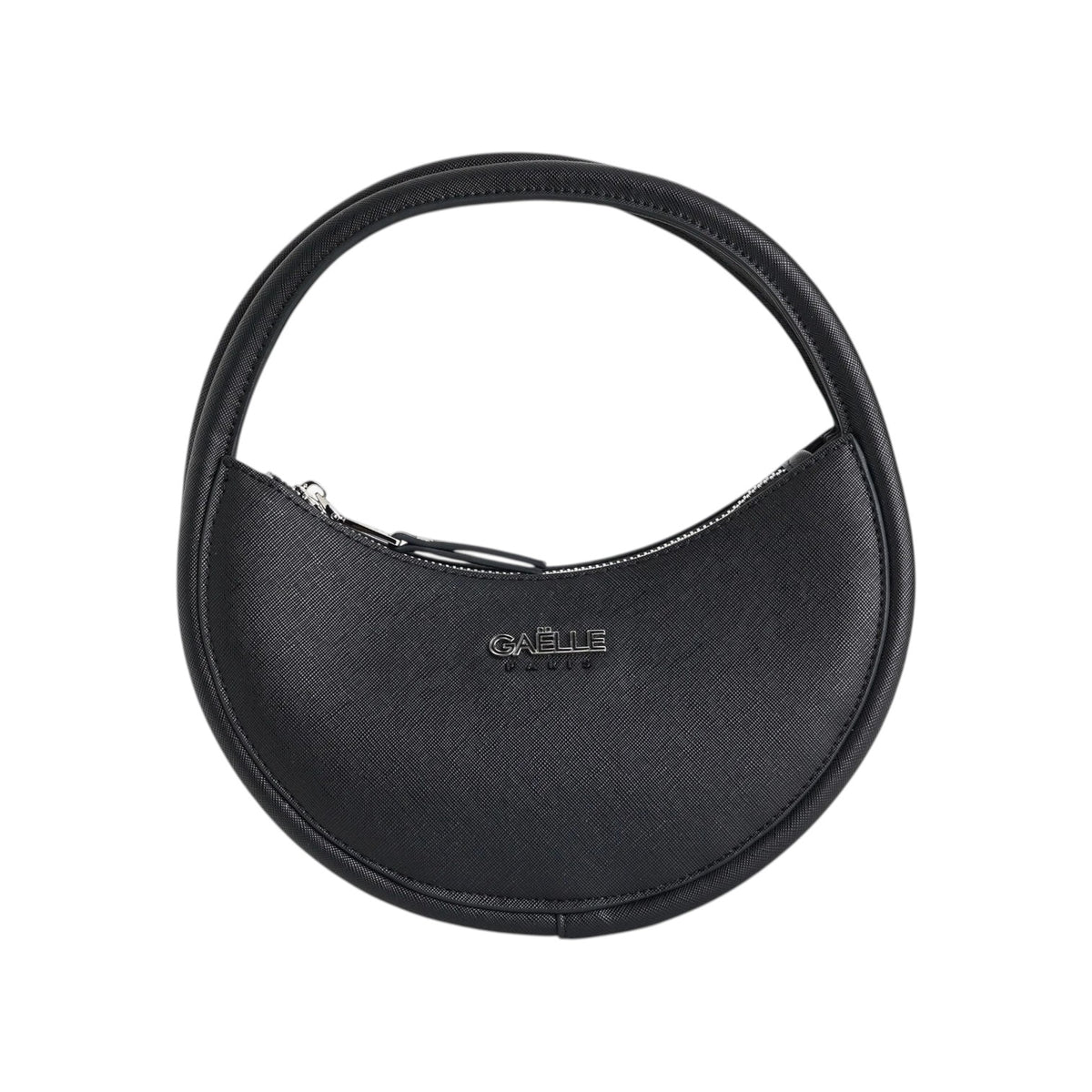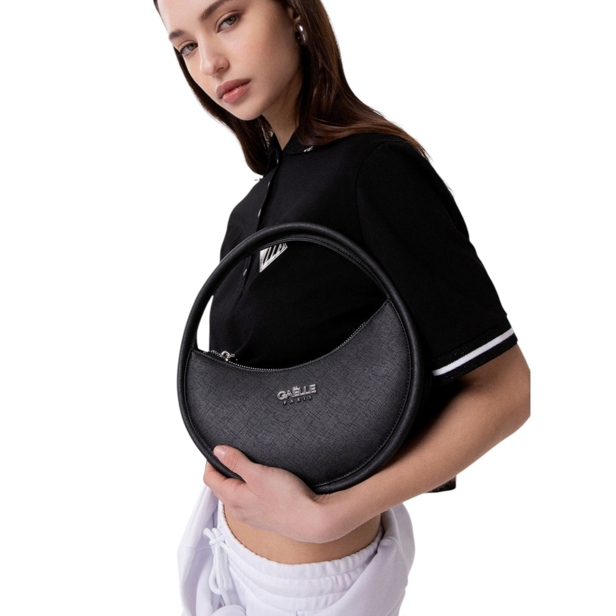 La Borsa a mano firmata Gaelle, forma a mezzaluna realizzata in ecopelle nella variante nera è caratterizzata da un manico rigido e da una chiusura con zip, l'interno è foderato in tessuto di cui dispone di taschini.