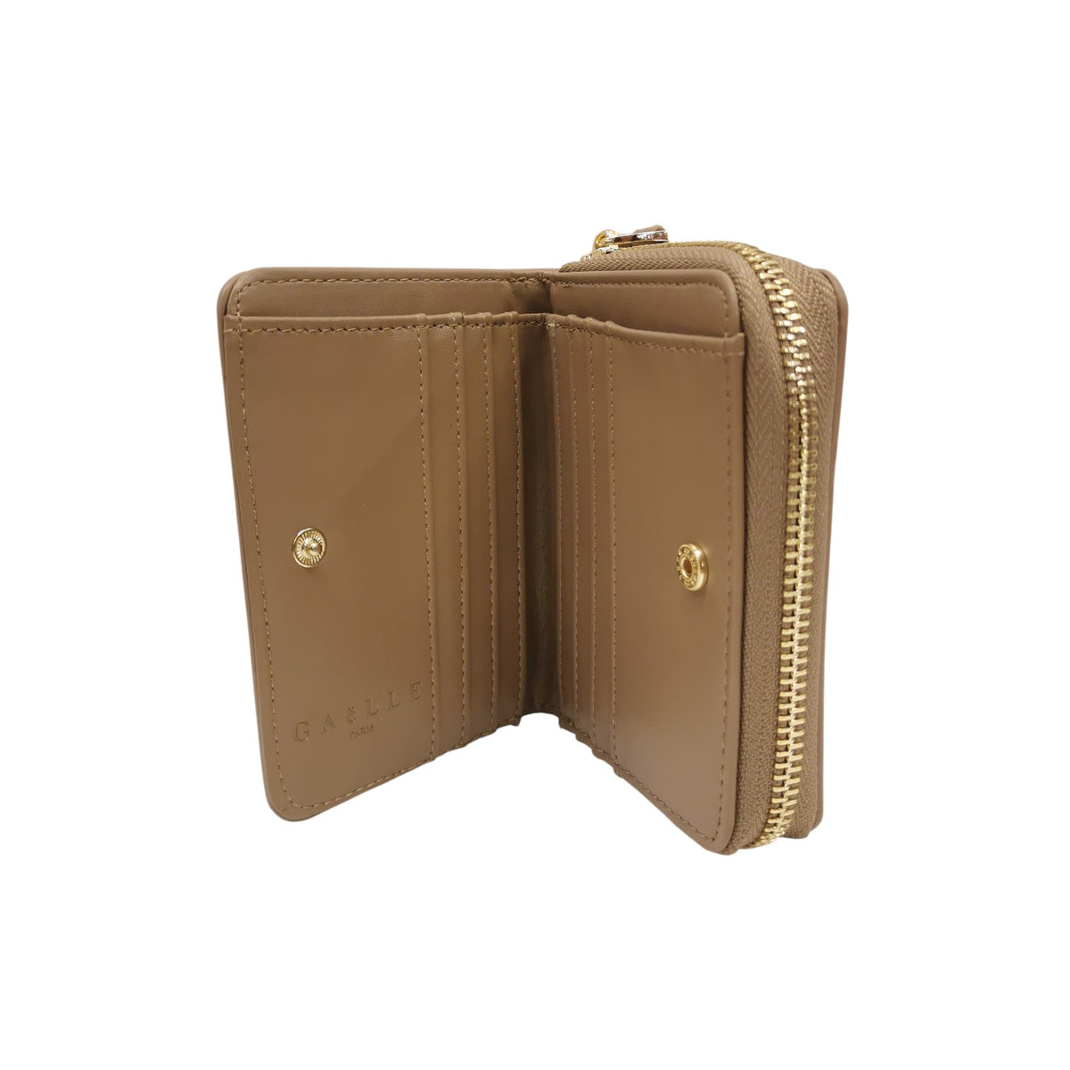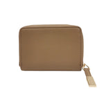 Il Portafoglio firmato Gaelle, elegante mini zip around in bottalato cammello, compatta ma funzionale. Realizzata in ecopelle di qualità, unisce stile e praticità. Perfetta per chi cerca un accessorio versatile da giorno e da sera. Presenta una doppia chiusura per una sicurezza ottimale: una cerniera dedicata allo scomparto portamonete e un bottone a pressione che apre il comparto per carte e banconote.