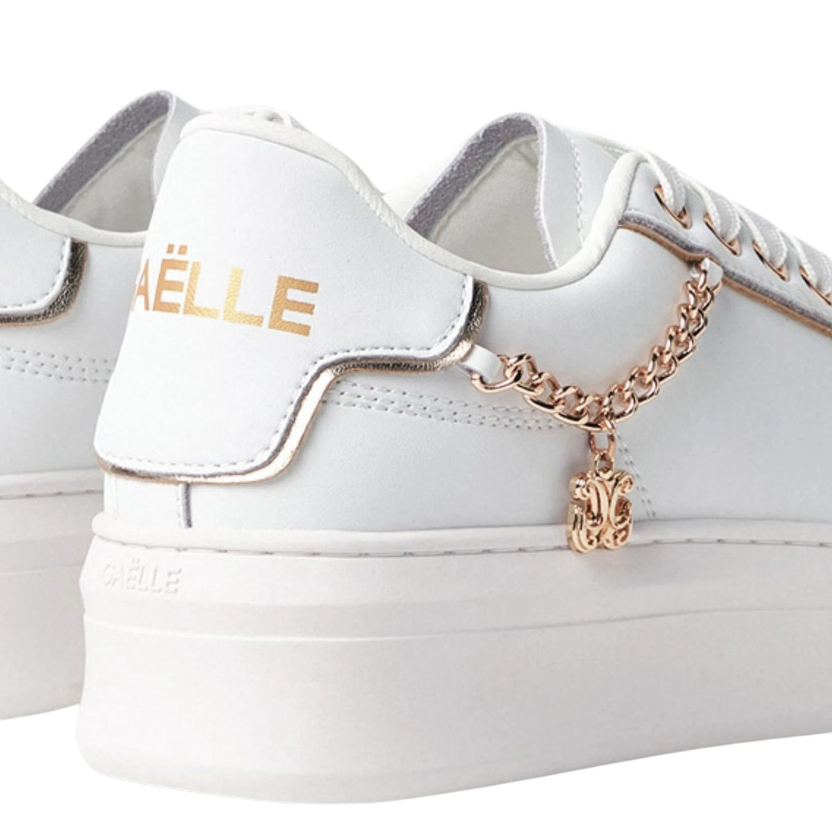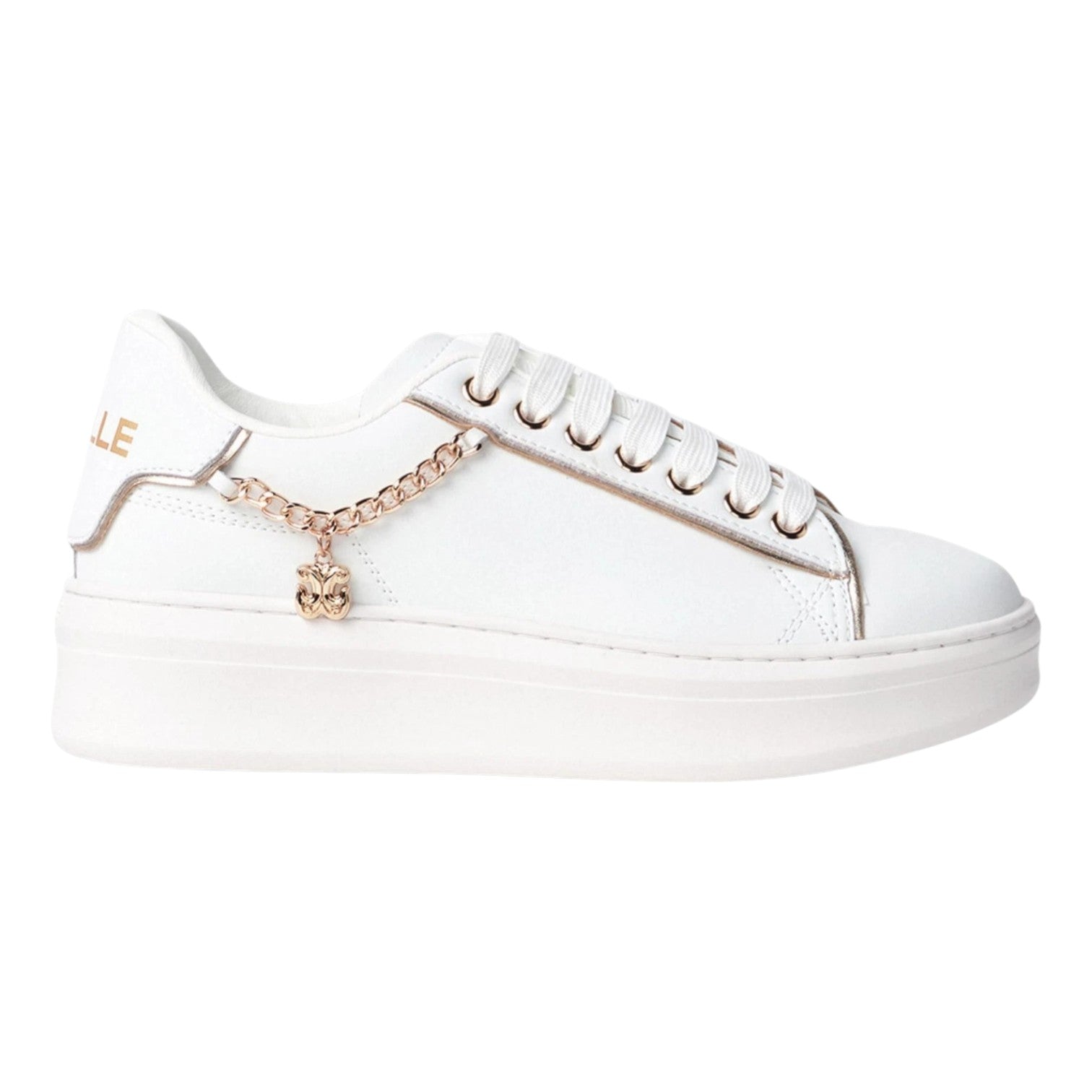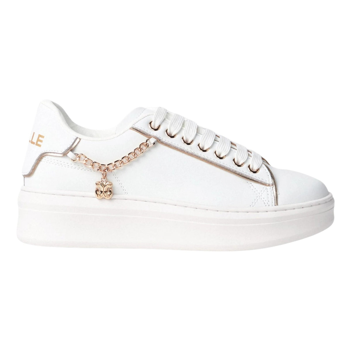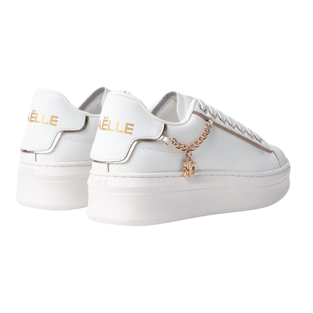 La Sneakers firmata Gaelle, modello platform di 4,5cm realizzata in misto pelle è caratterizzata da catenella laterale in oro con charm pendente sempre in oro, inoltre presenta un morbido plantare in ecopelle removibile, aggiungi un tocco di eleganza e comfort ai piedi.