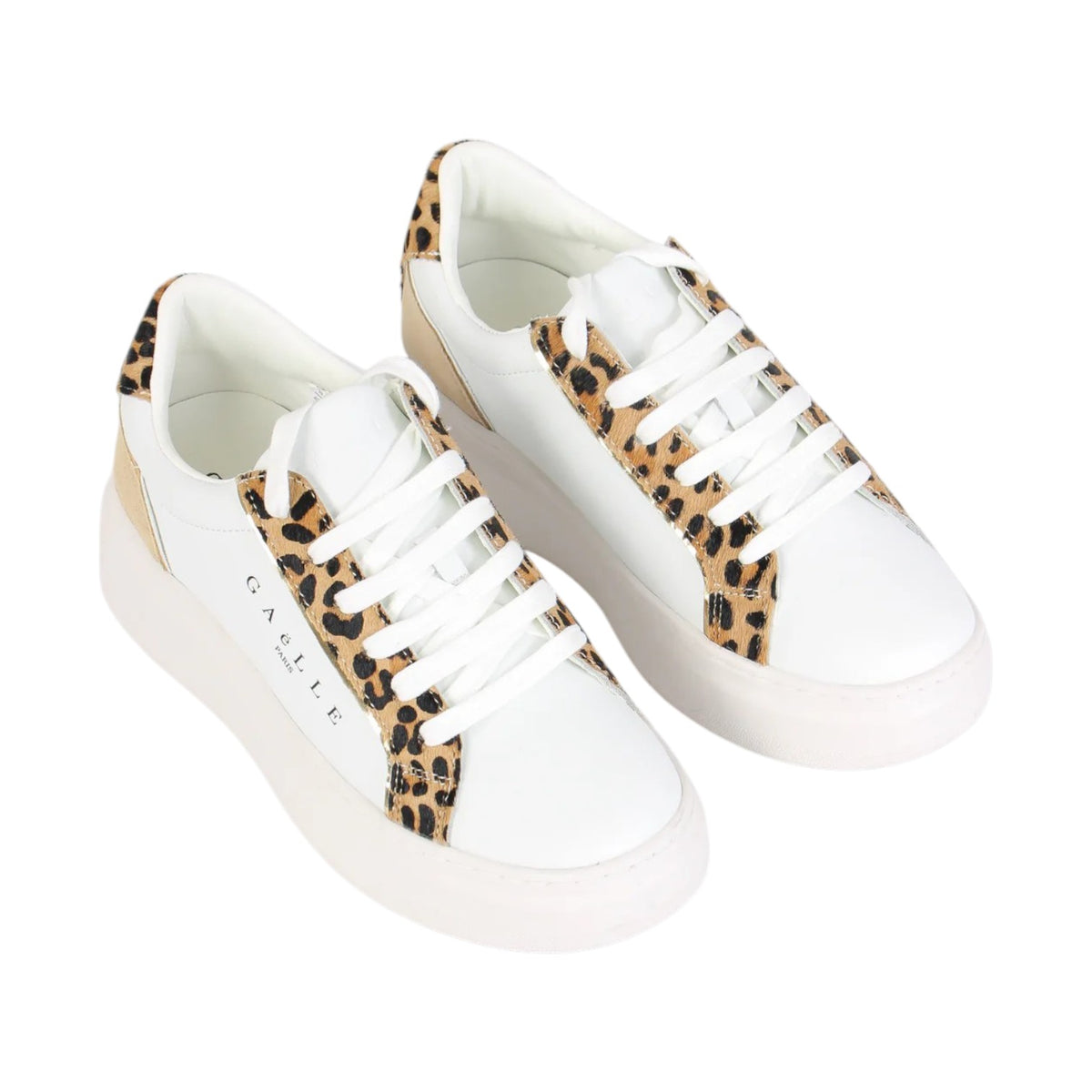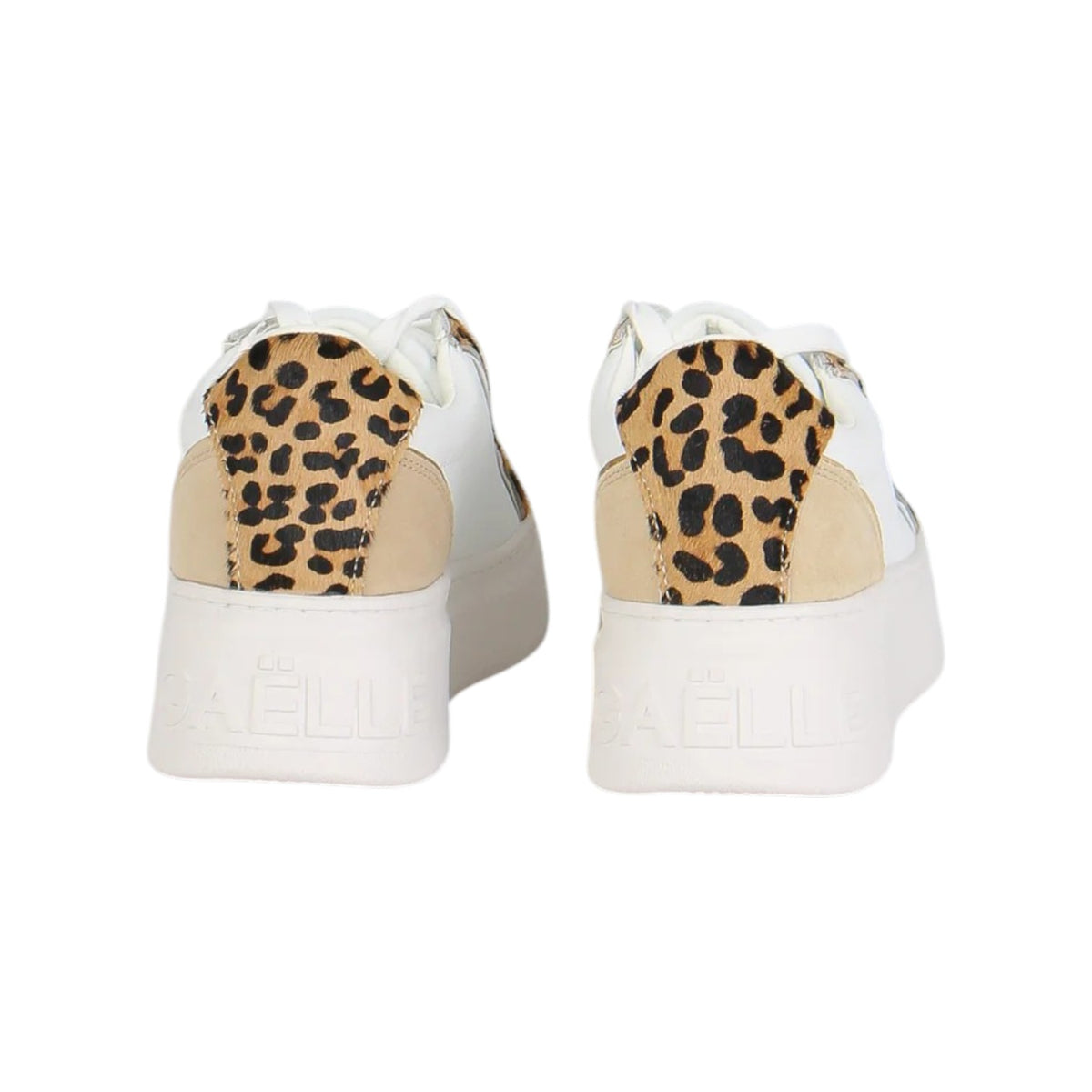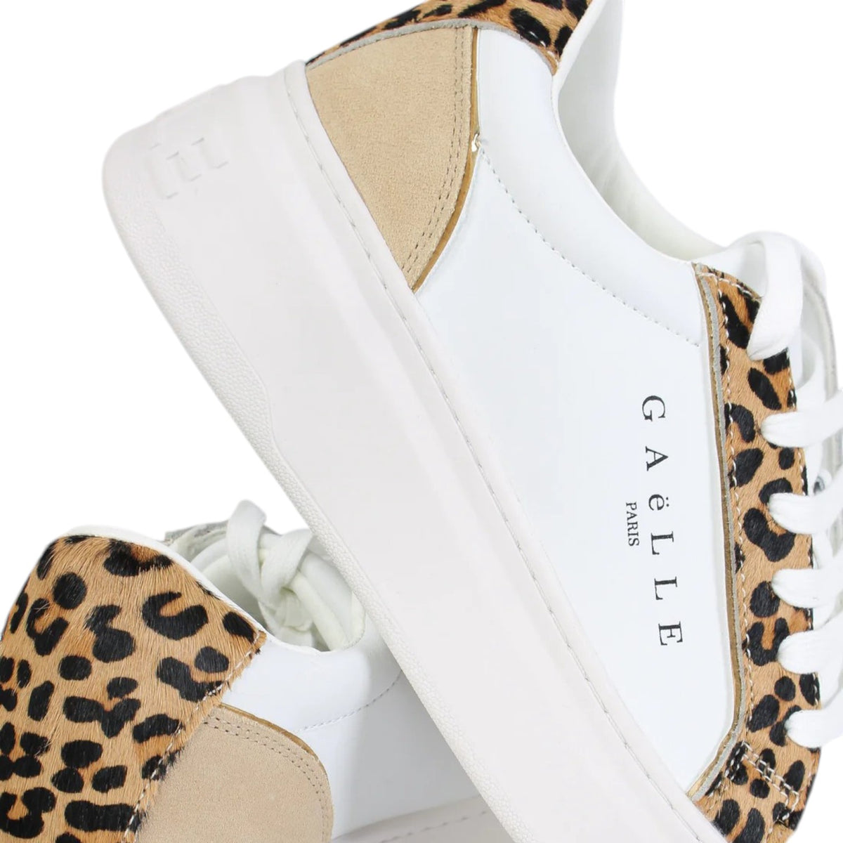La Sneakers firmata Gaelle, modello platform leggermente più rialzata sul retro, rendendola comoda e stabile per tutti i giorni, realizzata in misto pelle è caratterizzata da inserti animalier e rifiniture scamosciate con scritta logo a lato.
