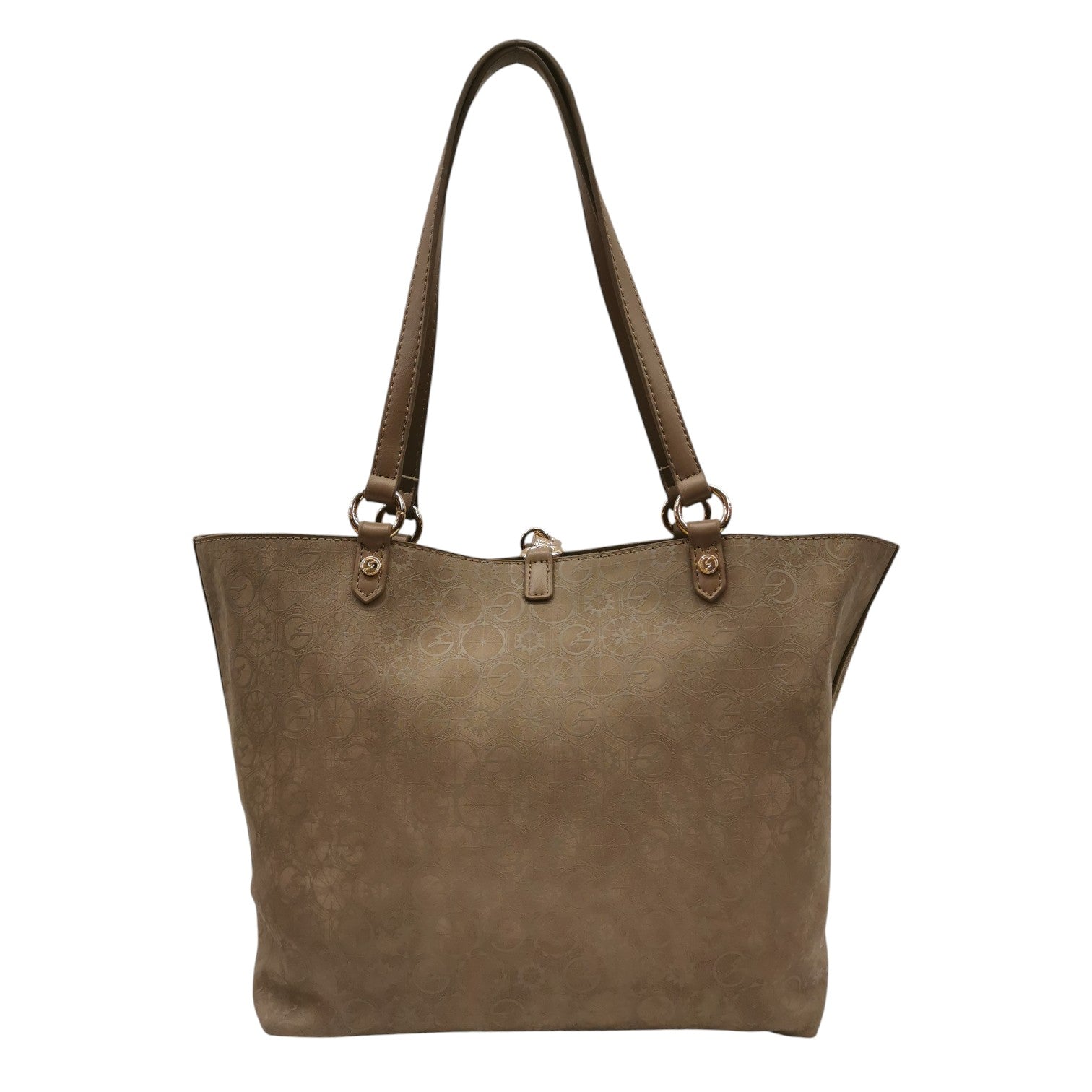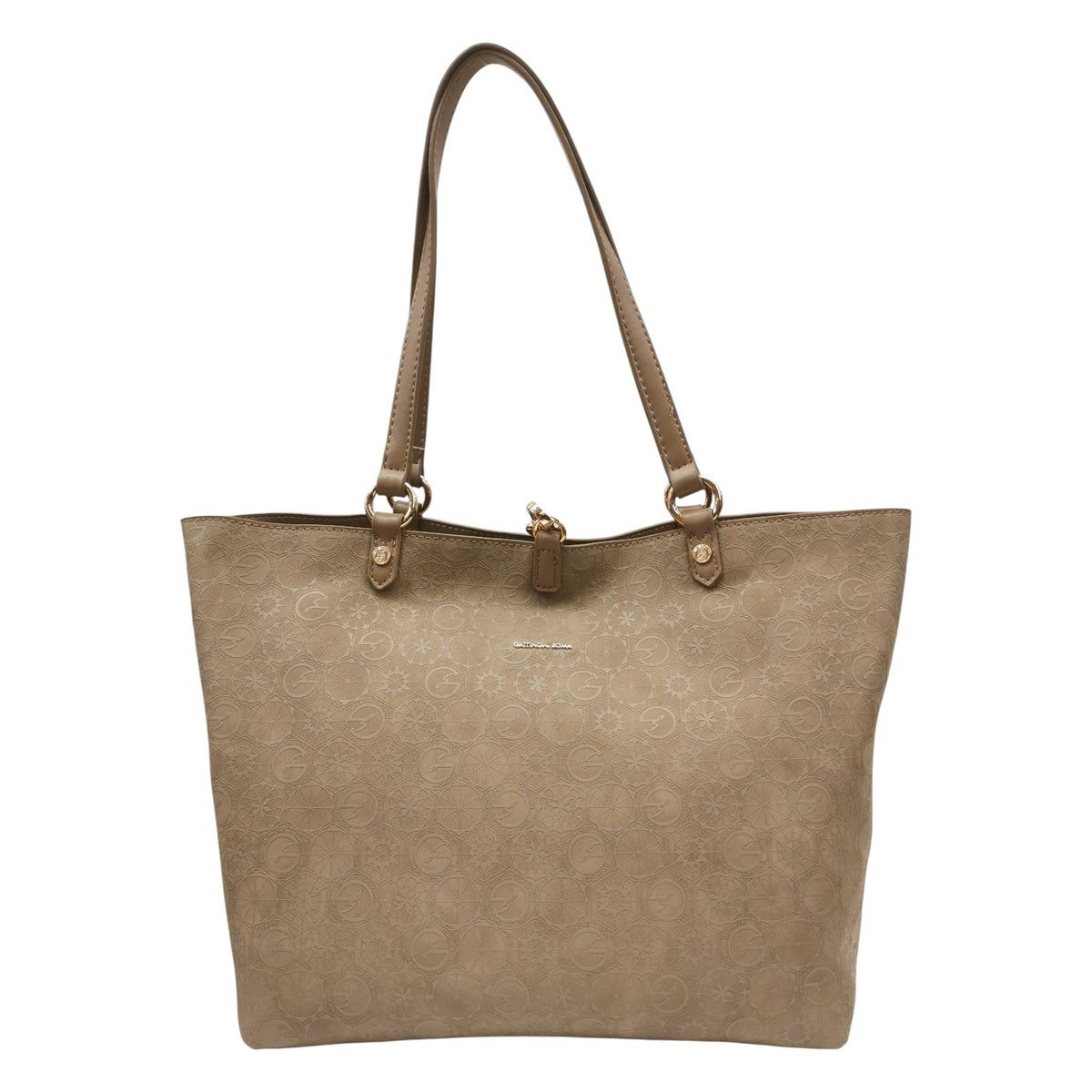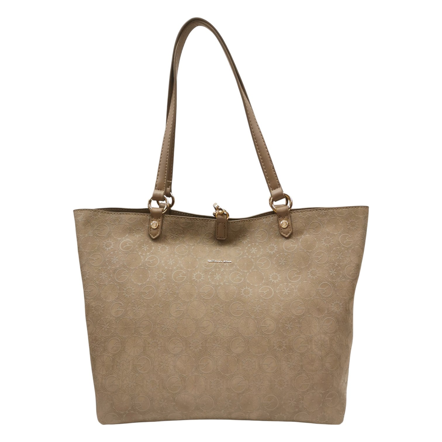 La Shopping Bag firmata Gattinoni Roma, modello reversibile realizzata in ecopelle tortora è caratterizzata da chiusura con piccolo moschettone. All'interno è presente una pochette in coordinato con chiusura zip, e internamente foderata in tessuto, dove troviamo una piccola taschina per oggetti più piccoli con zip. Tracolla in dotazione, applicabile tramite moschettoni.