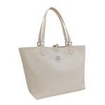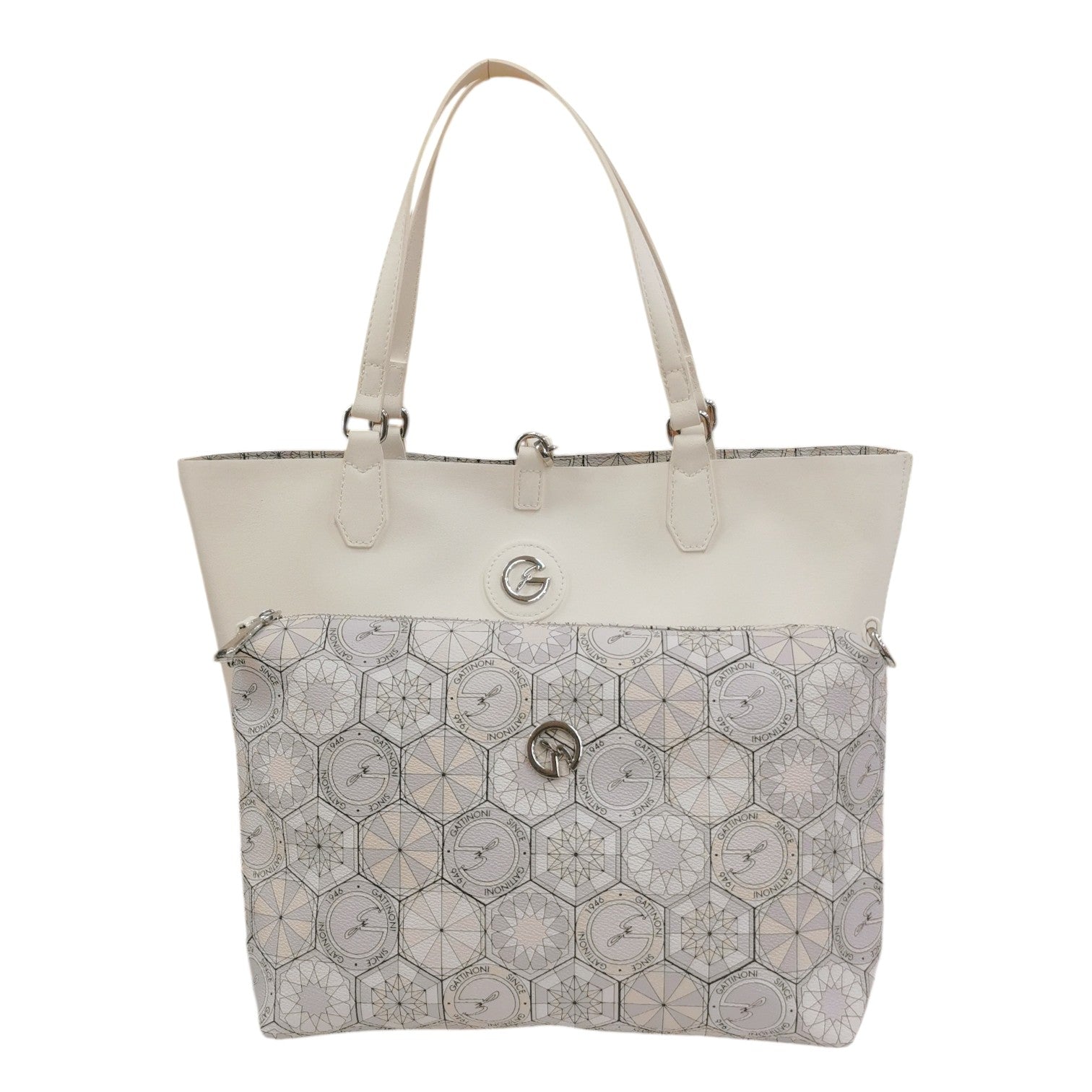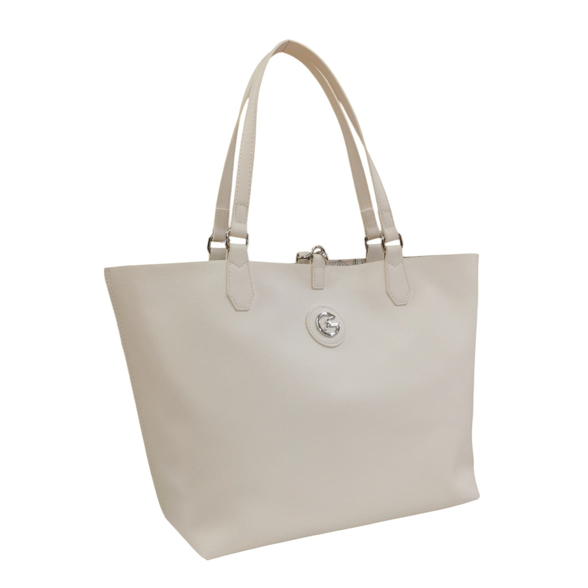 La Shopping Bag firmata Gattinoni Roma, in questa bellissima variante bianca realizzata in ecopelle laminata modello reversibile con stampa teodosia con chiusura con moschettone e pochette interna con zip. Presenta una tracolla removibile e logo monogram in metallo frontale.