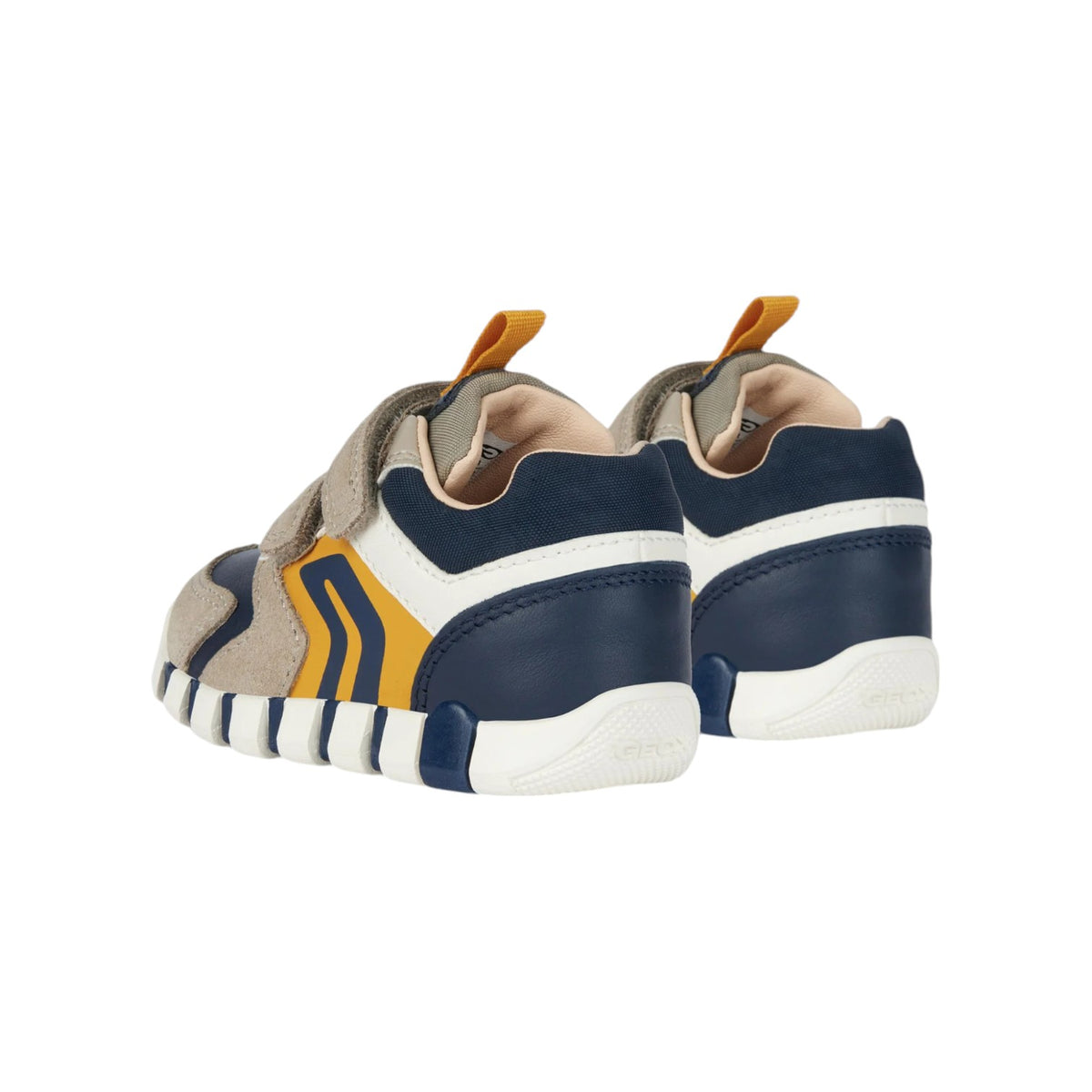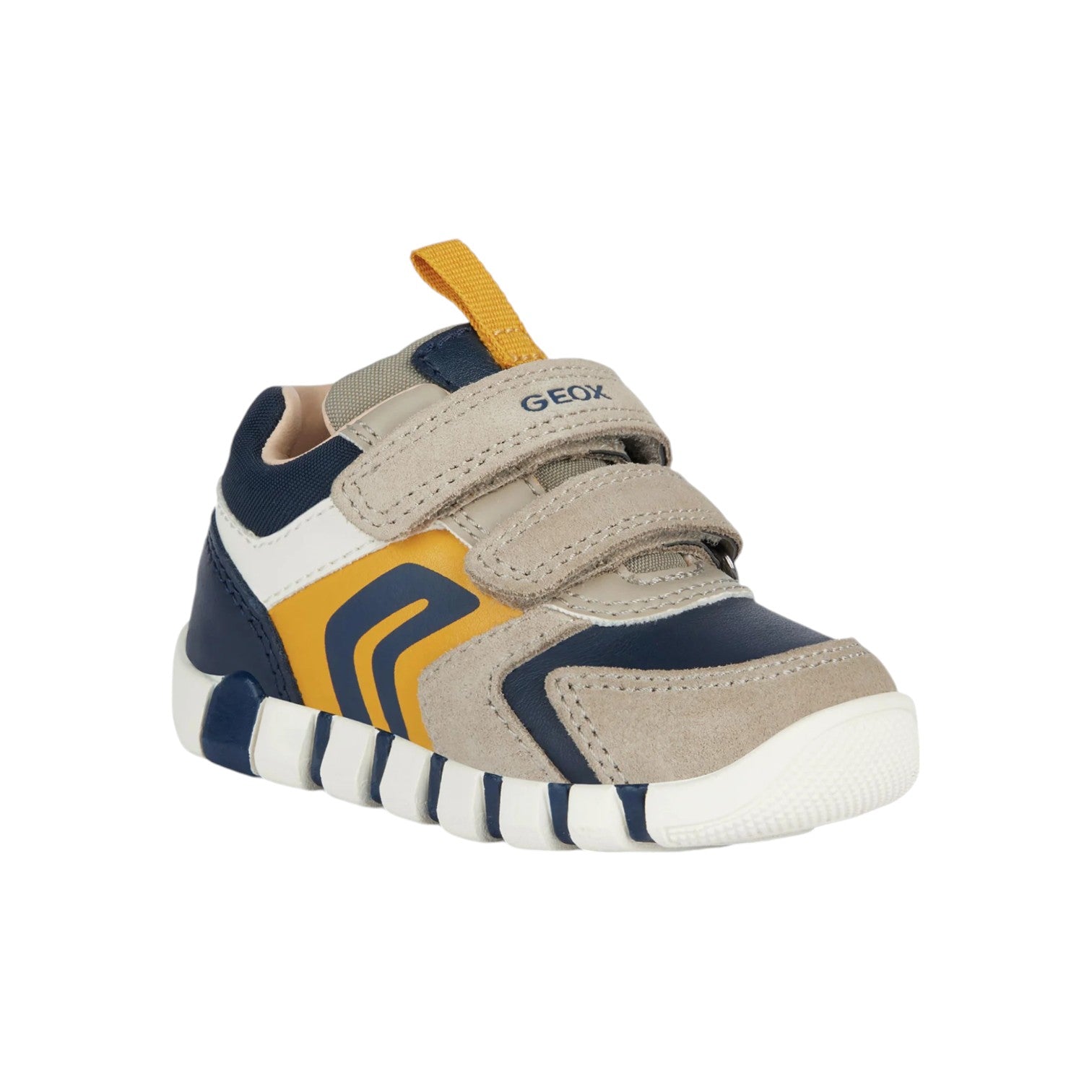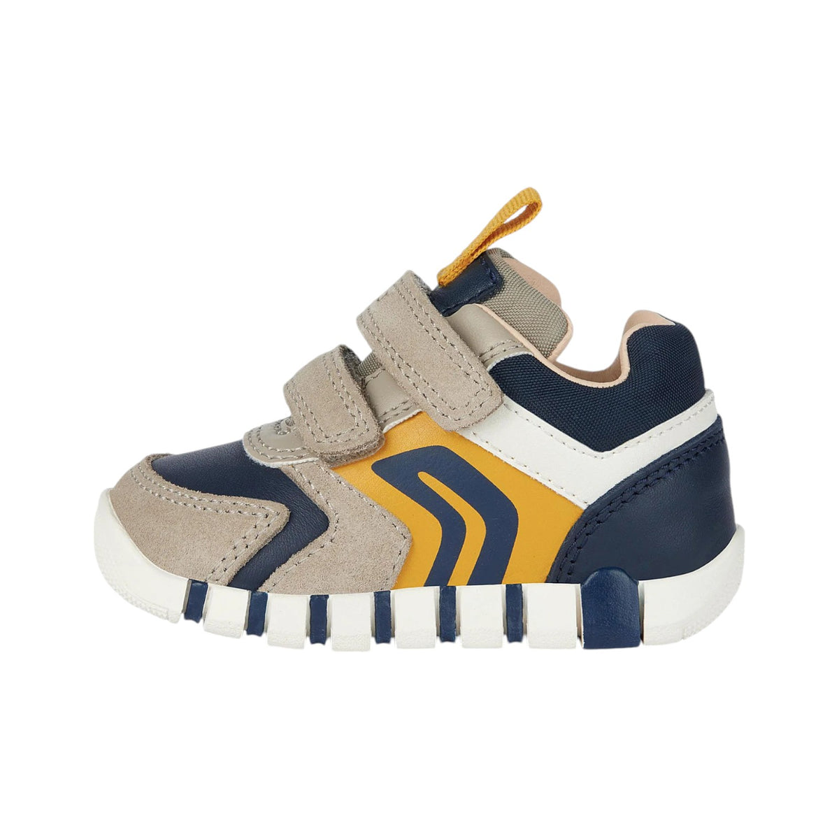 La Scarpa con strappo firmata Geox, realizzata in scamosciato con inserti in ecopelle, primi passi baby ammortizzata e flessibile, qui declinata in beige con dettagli a contrasto blu navy, è un modello ideale per le sue prime esplorazioni.