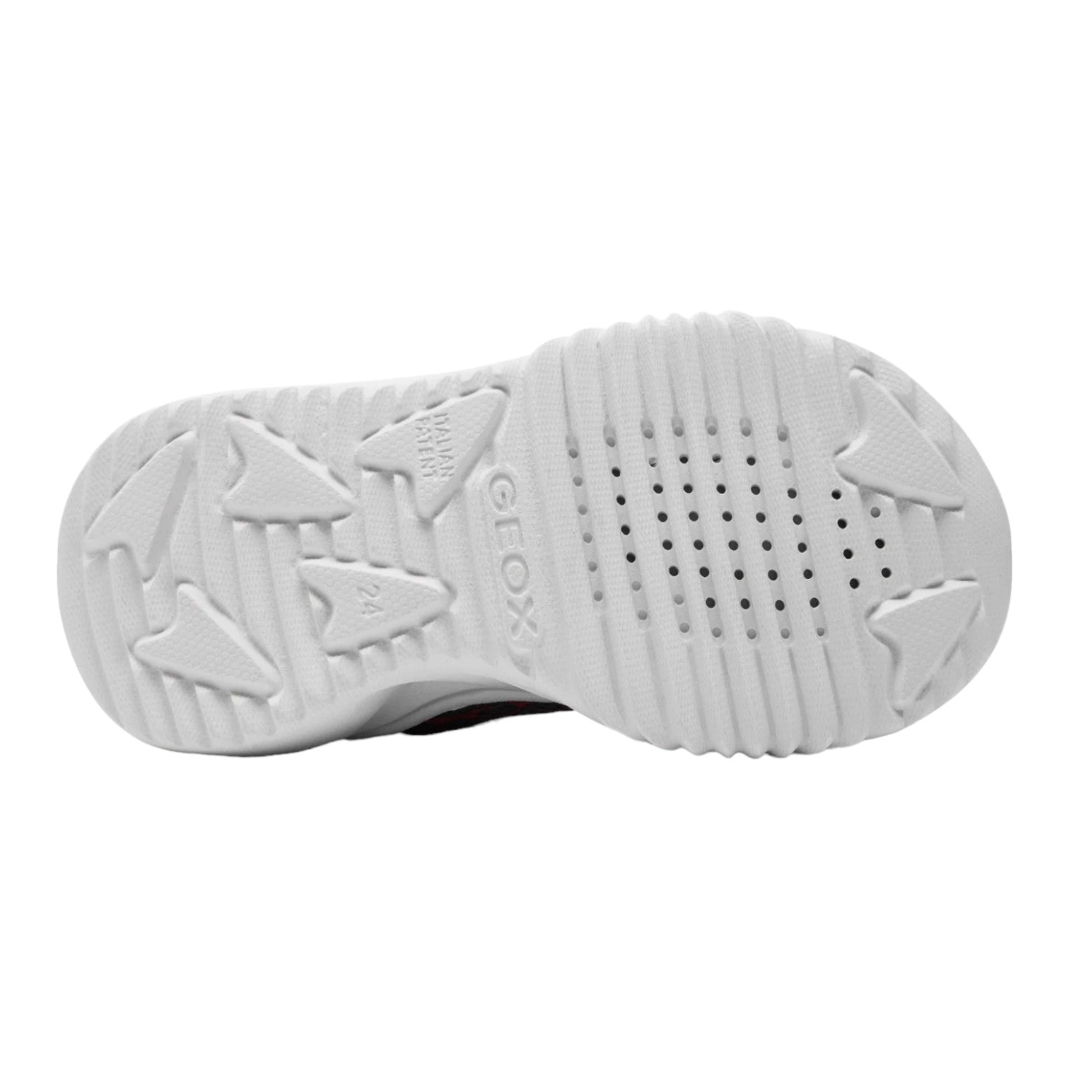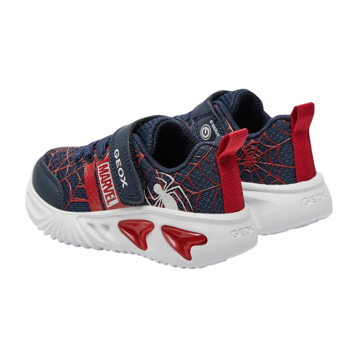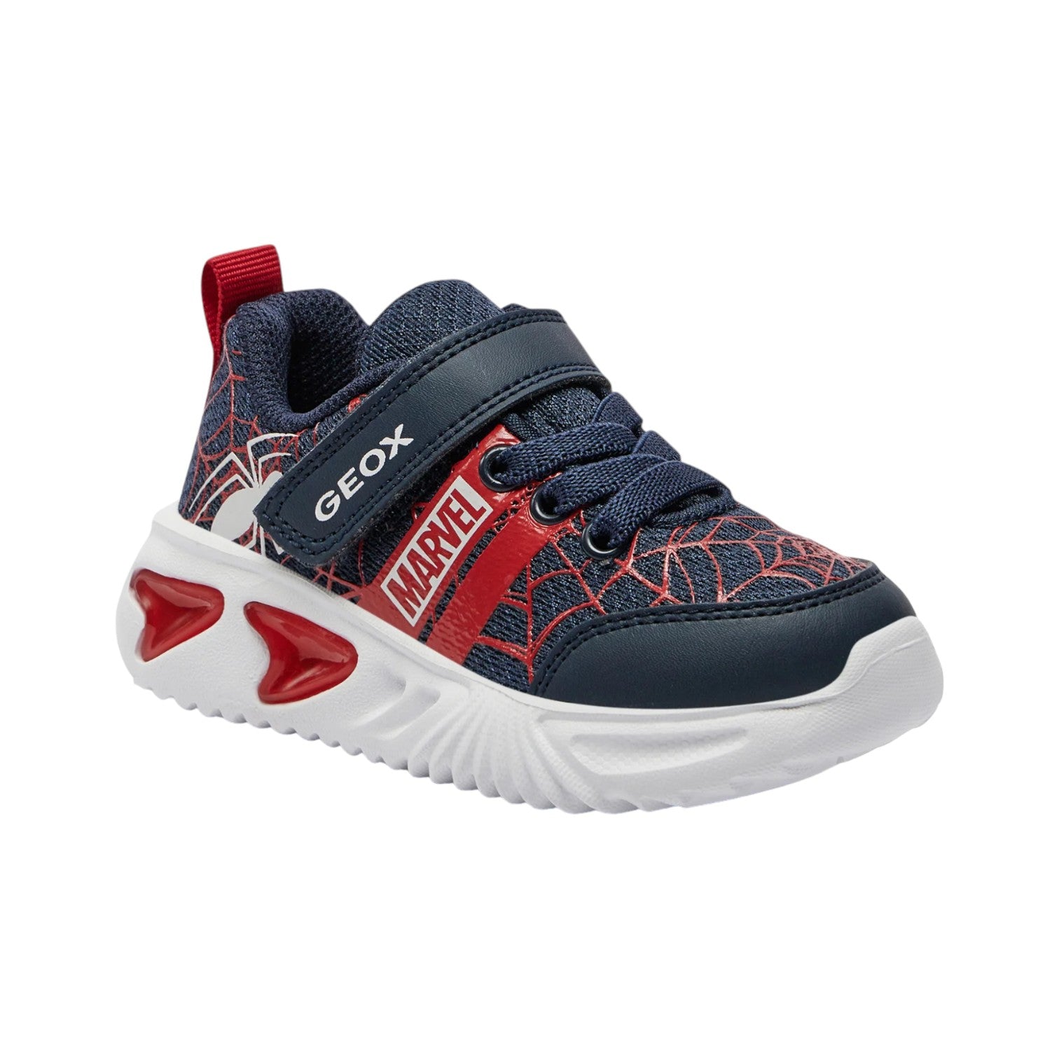 La Sneakers firmata Geox, ispirata al famoso personaggio Spider Man realizzata in ecopelle e tessuto blu e rosso è dotata di sottopiede antibatterico estraibile e suola dotata di luci e con tecnologia Geox respira che permette un'ottima traspirazione. Pulsante on/off per il funzionamento delle luci. Lacci elastici e velcri per una veloce e facile calzata.