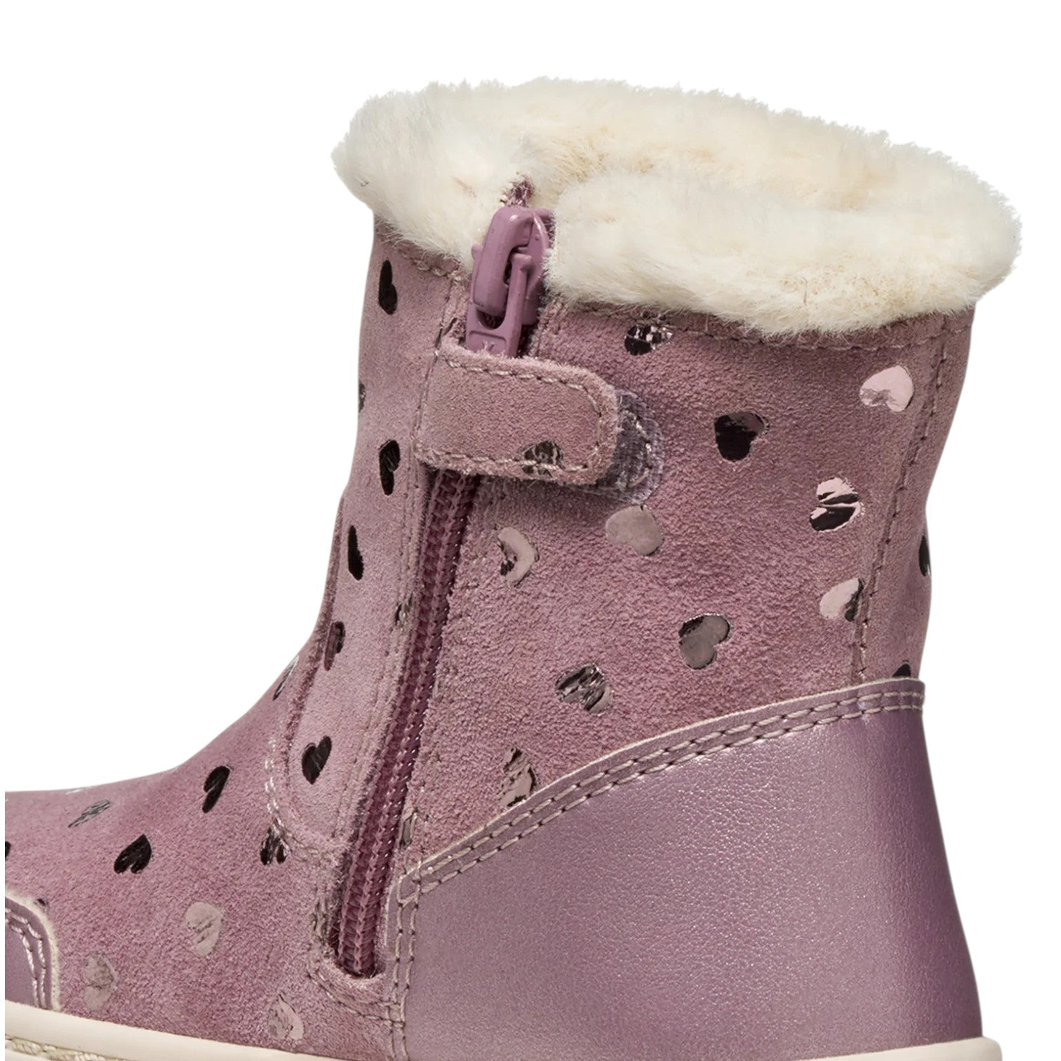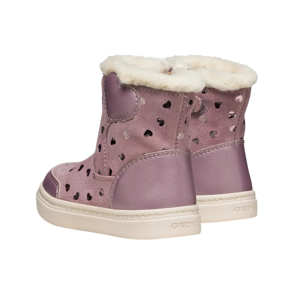 Lo Stivaletto firmato Geox, in pelle scamosciata è caratterizzato da stampa cuori in tessuto laminato all over e da fodera in pelliccia sintetica, sottopiede in tessuto caldo, fondo traspirante in gomma con Flexy System.