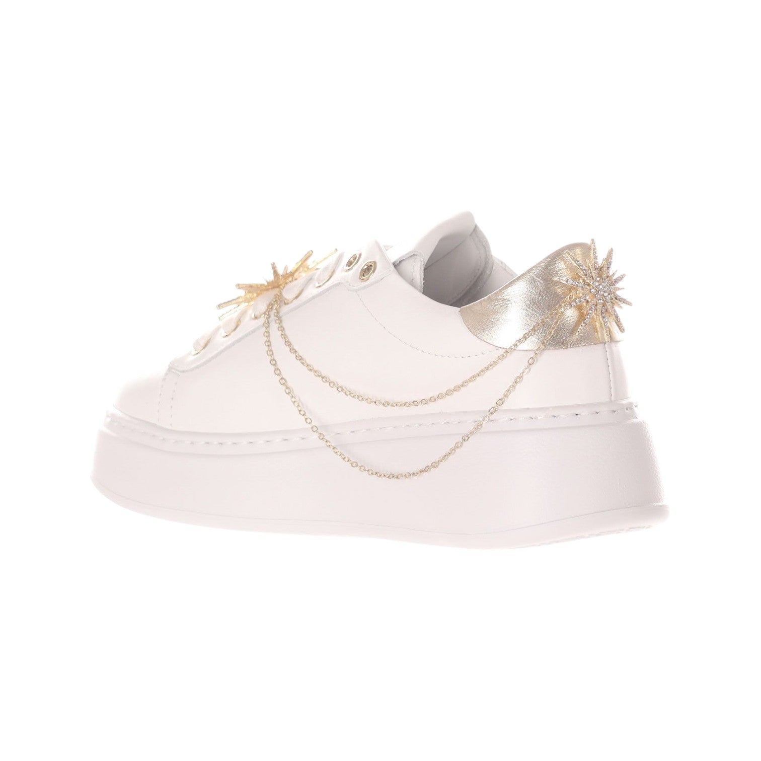 La Sneakers firmata Gio+, realizzata in pelle di colore bianco con tallone laminato dorato è caratterizzata da occhielli in metallo dorati, targhetta sulla linguetta con il logo dorato e sono applicate delle catene decorative. Il fondo platform è in leggerissima gomma EVA e rialza il tallone dal suolo di 5cm, internamente è foderata in pelle con soletta interna è estraibile. Una scarpa comoda, pratica e leggera, ideale per le donne giovani che amano lo stile casual e sportivo, perfetta per aggiungere una nota glamour ai look da giorno.