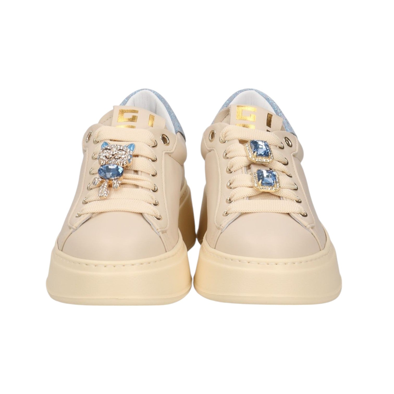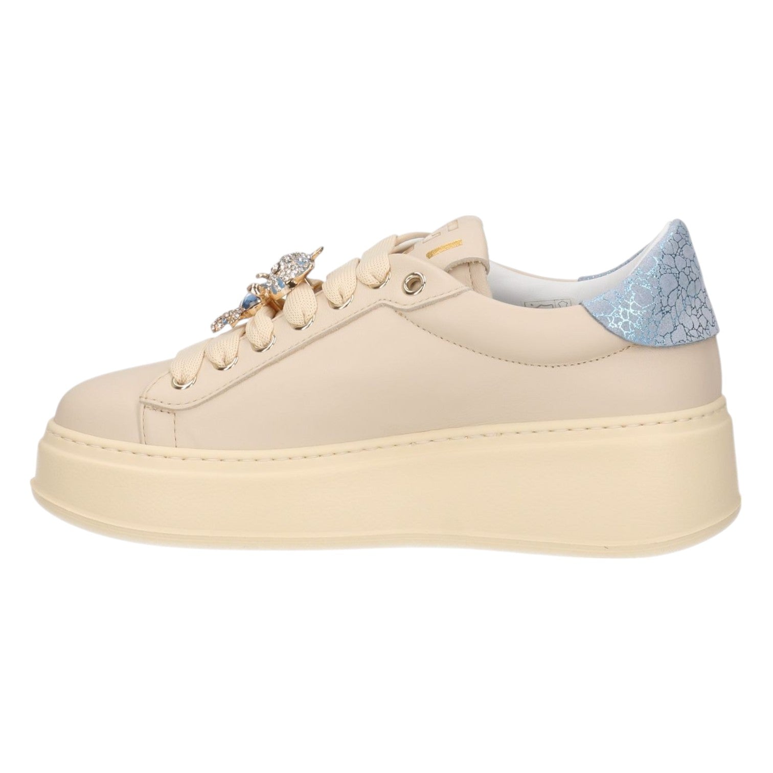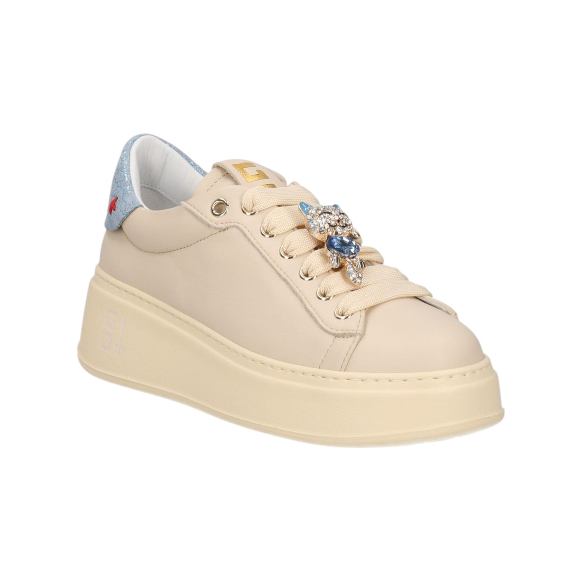 La Sneakers firmata Gio+, realizzata in pelle nella variante latte con talloncino celeste è caratterizzata da occhielli in metallo dorati, targhetta sulla linguetta con il logo dorato e sono applicati accessori gioiello. Il fondo platform è in leggerissima gomma EVA e rialza il tallone dal suolo di 5cm, internamente è foderata in pelle con soletta interna è estraibile.