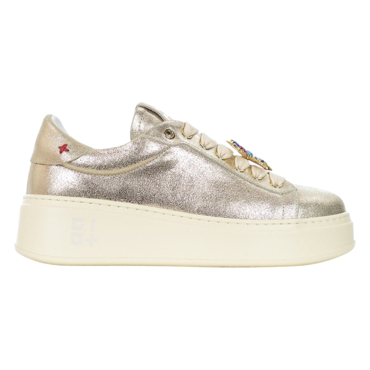 La Sneakers firmata Gio+, realizzata in pelle laminata dorata è caratterizzata da occhielli in metallo dorati, targhetta sulla linguetta con il logo dorato e sono applicate degli accessori gioiello a forma di fiore con pietre colorate. Il fondo platform è in leggerissima gomma EVA e rialza il tallone dal suolo di 5cm, internamente è foderata in pelle con soletta interna è estraibile. Una scarpa comoda, pratica e leggera, ideale per le donne giovani che amano lo stile casual e sportivo, perfetta per aggiungere una nota glamour ai look da giorno.