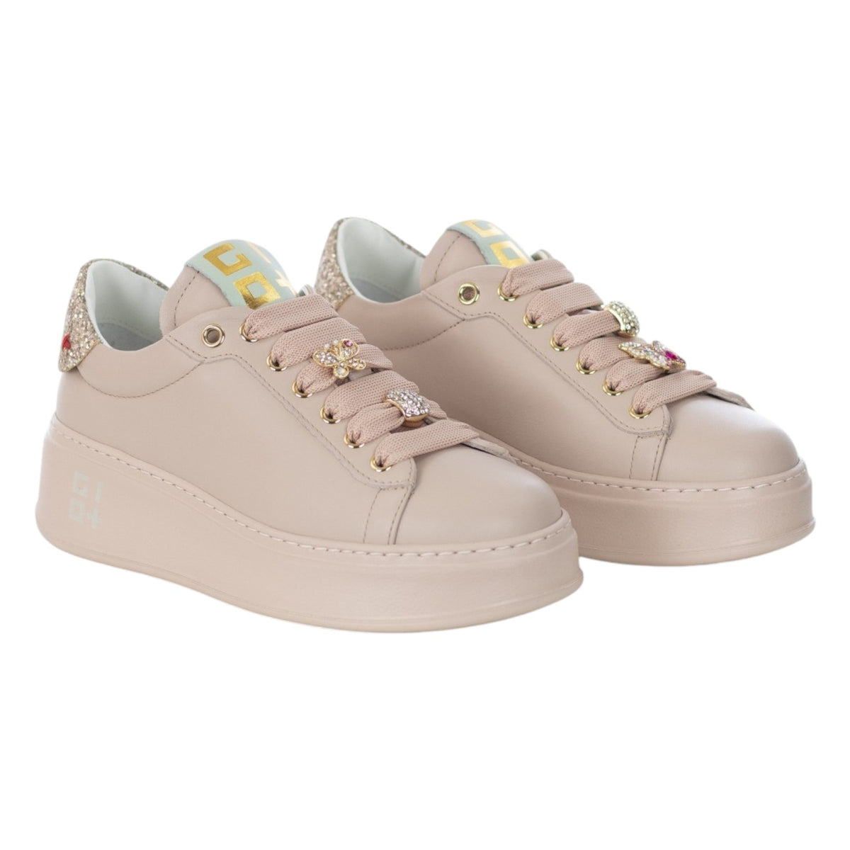 La Sneakers firmata Gio+, realizzata in pelle rosa con talloncino tempestato di strass, sono applicati accessori gioiello, di cui sul piede destro uno a forma di farfalla e sul piede sinistro uno semplice a forma di cerchio. Il fondo platform è in leggerissima gomma EVA e rialza il tallone dal suolo di 5cm, internamente è foderata in pelle con soletta interna estraibile.