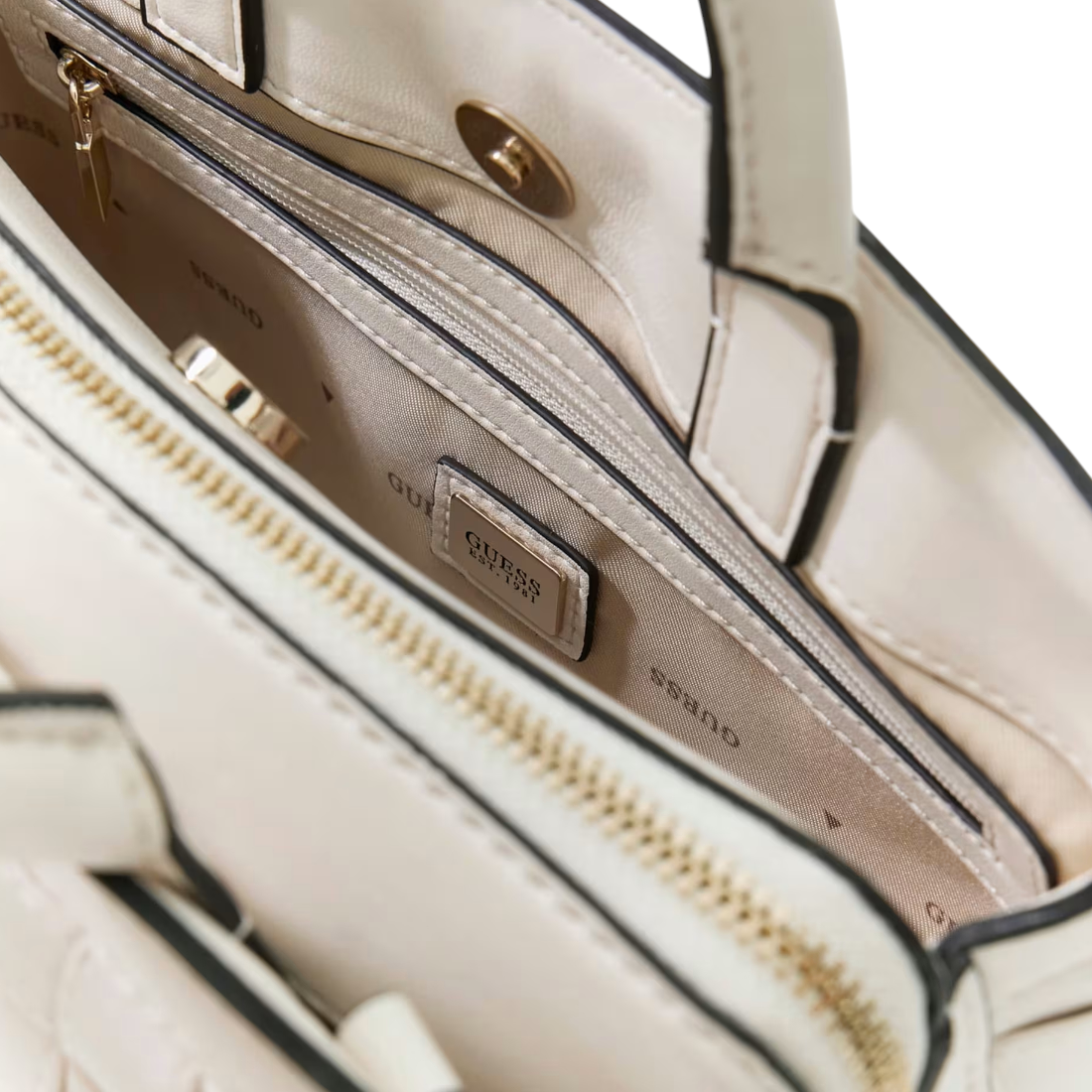 La Borsa a mano firmata Guess, realizzata in ecopelle qui proposta nella variante bianca con un'accattivante texture intrecciata, questa borsa a mano unisce raffinatezza e praticità. Le finiture dorate lucide aggiungono un tocco di eleganza, mentre l'interno curato nei minimi dettagli mantiene i tuoi oggetti essenziali organizzati con diversi scomparti, tasche a bustina e una sicura chiusura con zip. Passa senza sforzo dai robusti doppi manici alla tracolla regolabile e staccabile per adattarla al tuo umore e all'occasione.
