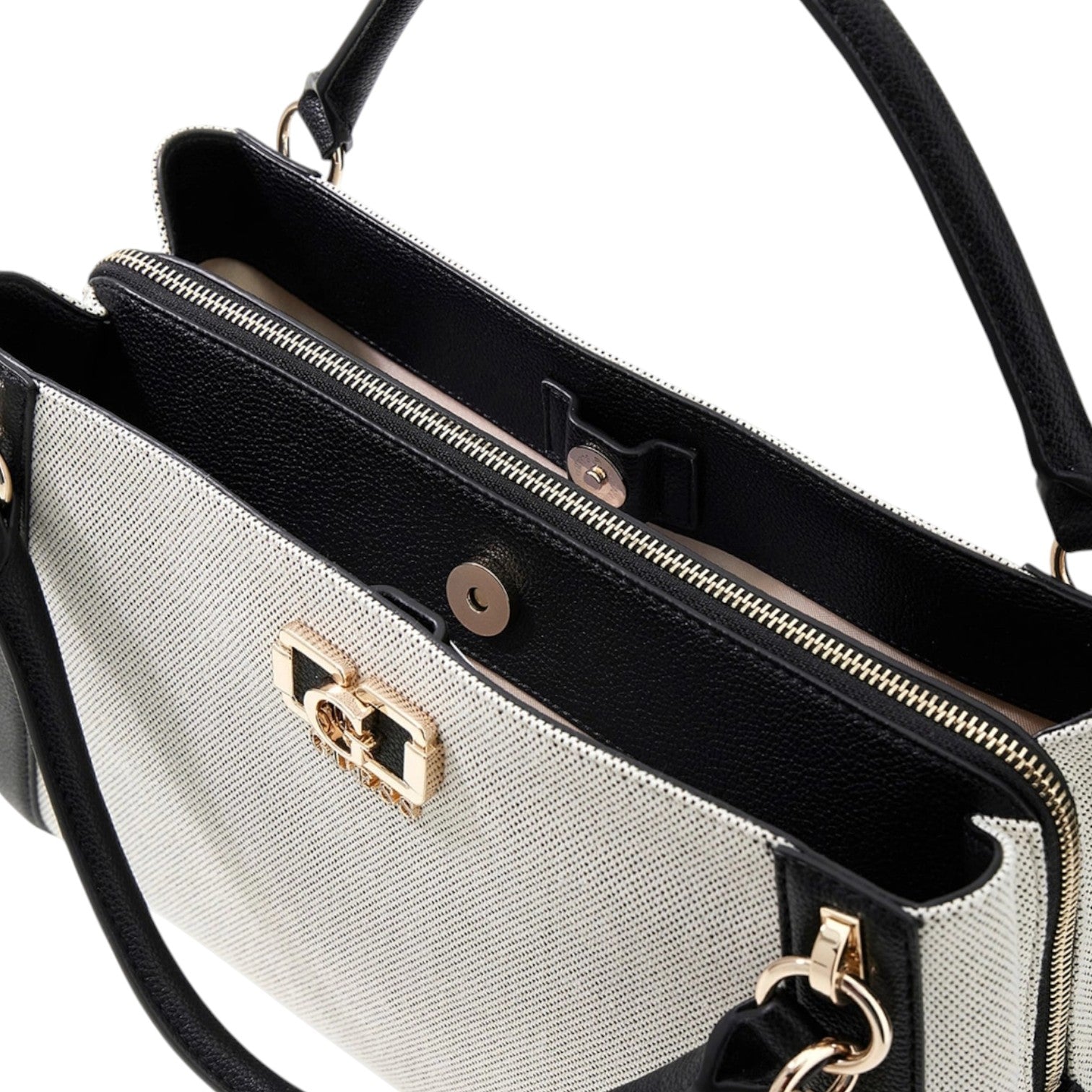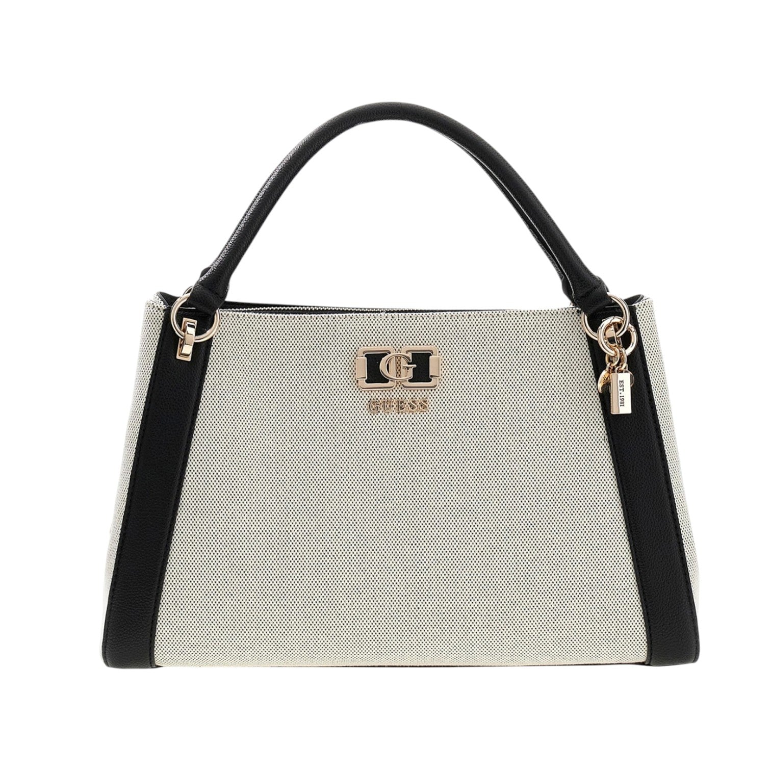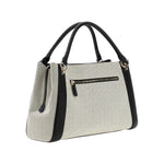 La Borsa a mano firmata Guess, realizzata in tessuto qui proposta nella variante naturale/nero è caratterizzata da inserti in ecopelle e da tre scomparti di cui due chiusi con bottone e quello centrale chiuso con zip, presenta una tracolla interna.