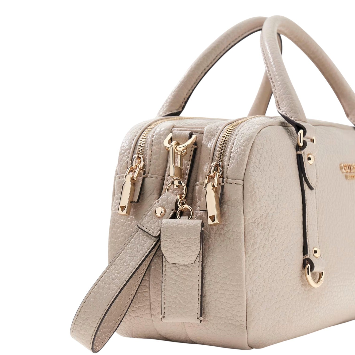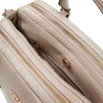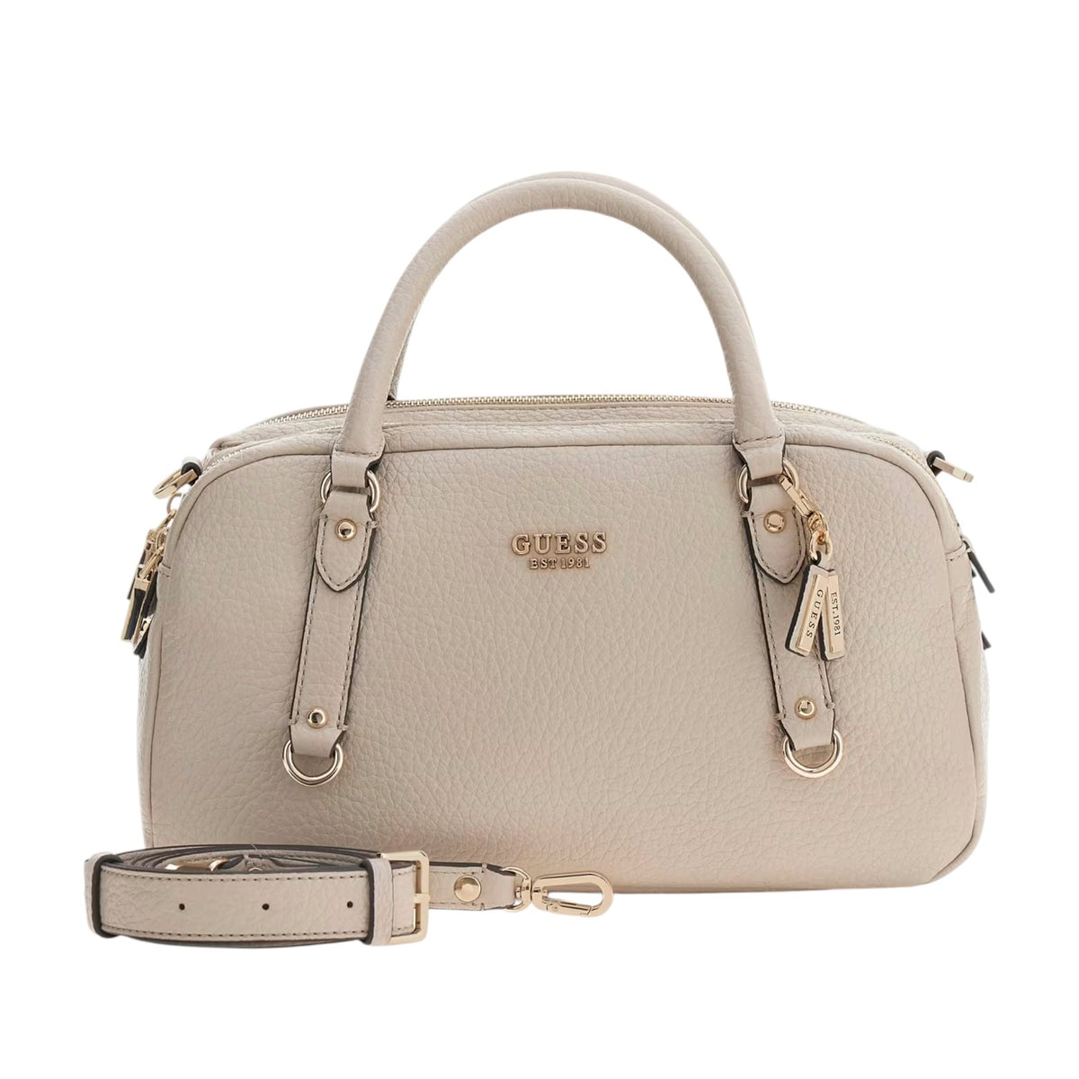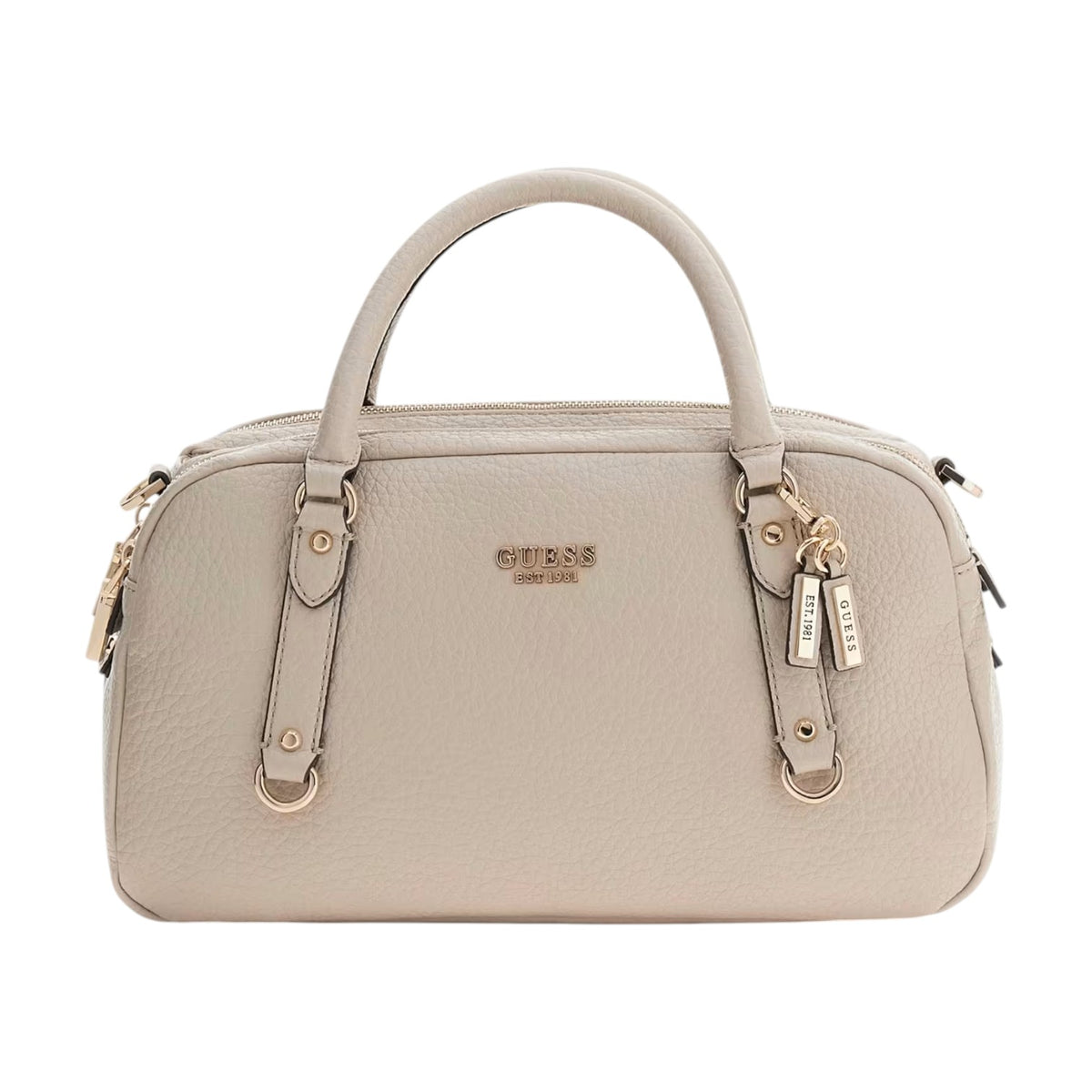 La Borsa a mano firmata Guess, realizzata in ecopelle qui proposta nella variante tortora chiaro è caratterizzata da ciondoli rimovibili con dettaglio logo e fodera personalizzata con logo, di cui dispone di tre scomparti di cui due chiusi con zip e quello centrale chiuso con bottone.