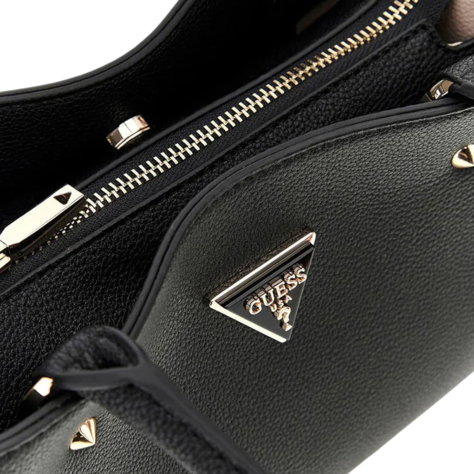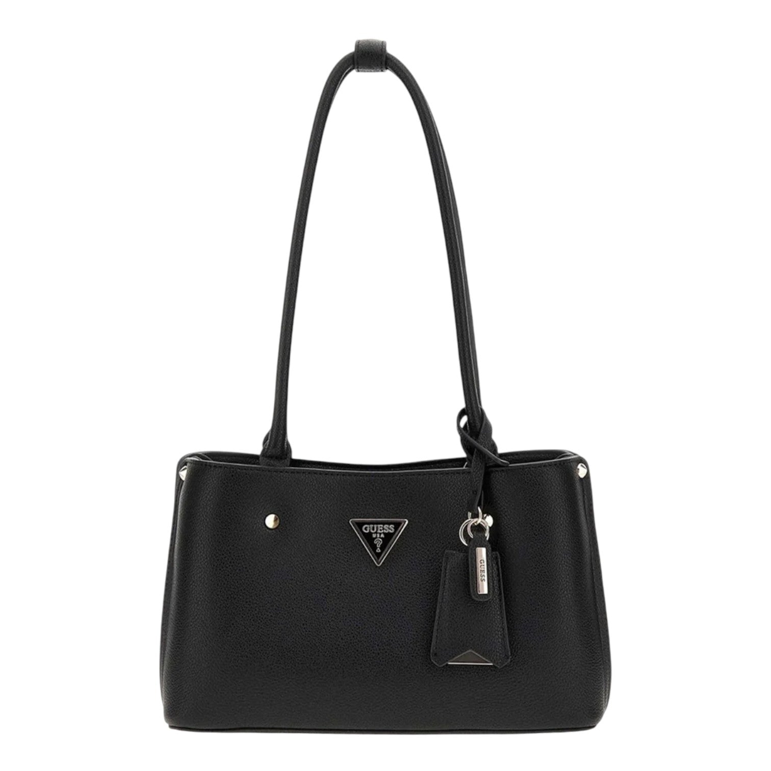 La Borsa a spalla firmata Guess, realizzata in ecopelle nera da un design strutturato con doppio manico, logo triangolare in metallo e un ciondolo charm abbinato. L'interno spazioso e organizzato con scomparti multipli e chiusura con zip rende questa borsa ideale per accompagnarti tutto il giorno, dall'ufficio al tempo libero.
