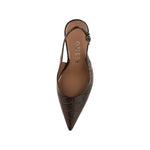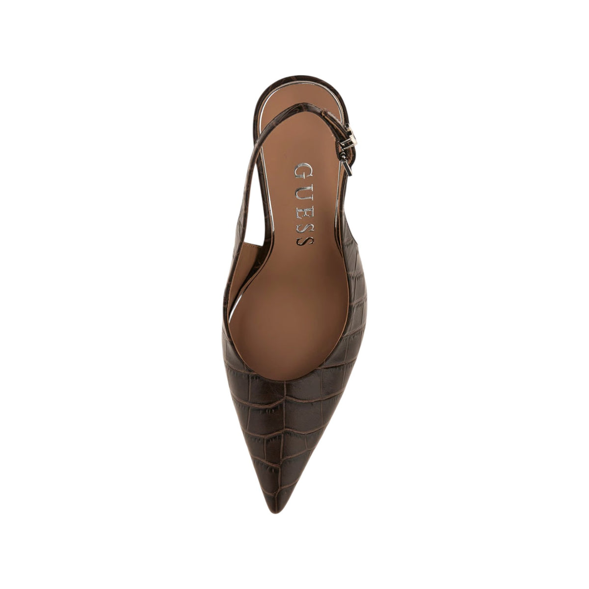 La Chanelle firmata Guess, realizzata in pelle nella variante marrone è caratterizzata da stampa effetto cocco all over e da chiusura con cinturino regolabile, il plantare è in pelle mentre il tacco sottile slancia la figura.