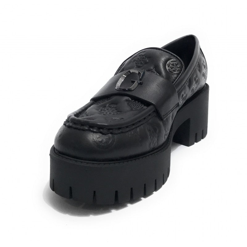 Il Mocassino firmato Guess, modello Wanyn, realizzato in pelle multilogo embossed, presenta una fascia con logo G in metallo brunito. Dispone di fodera e sottopiede in pelle con suola alta con carrarmato, in gomma.
