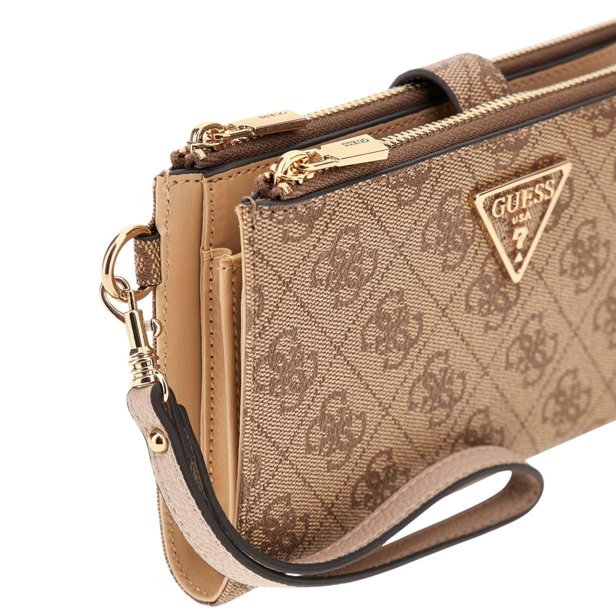 Il Portafoglio firmato Guess, realizzato in ecopelle con stampa logo all over presenta uno scomparto principale con slots per carte di credito e doppia tasca porta monete con cerniera lampo, il triangolo logo in metallo frontale aggiunge un tocco in più al portafoglio.