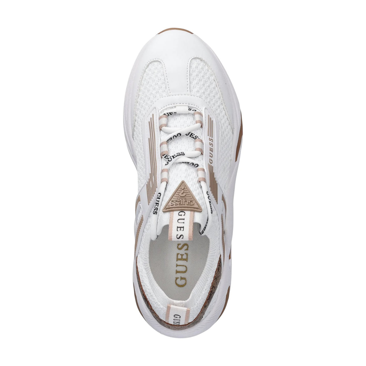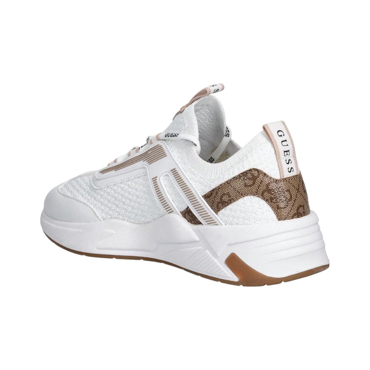 La Sneakers firmata Guess, realizzata in tessuto bianco è caratterizzata da punta leggermente rigida arrotondata e da logo 4G impresso. Presenta un dettaglio con logo-script sul davanti e sul retro; logo a triangolo sul lato. L'interno è foderato in tessuto di cui ha un plantare estraibile.