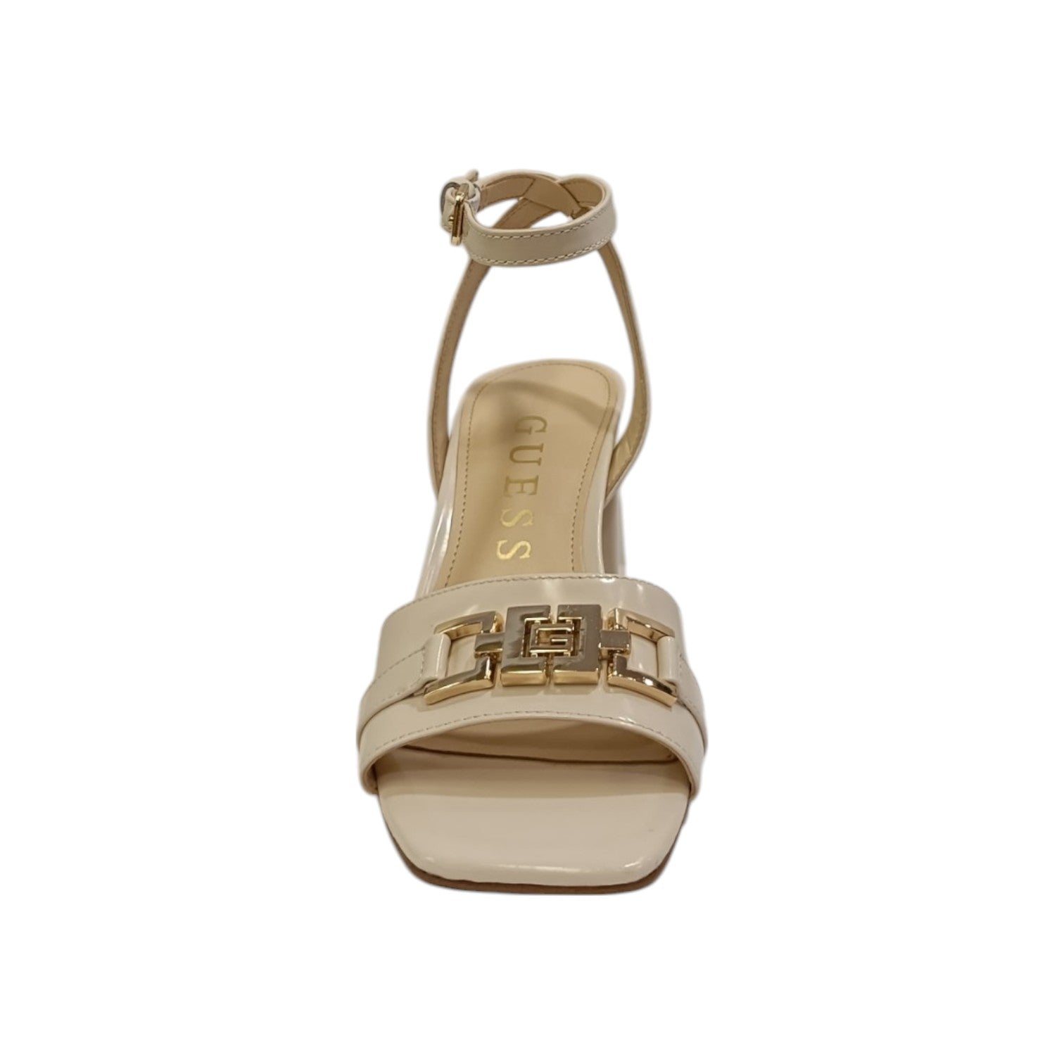 Il Sandalo firmato Guess, qui proposto nella variante crema realizzato in pelle è caratterizzato da una punta quadrata e da dettaglio frontale in metallo con scritta logo, presenta una fodera interna in ecopelle accompagnato da un morbido sottopiede con chiusura a cinturino alla caviglia.