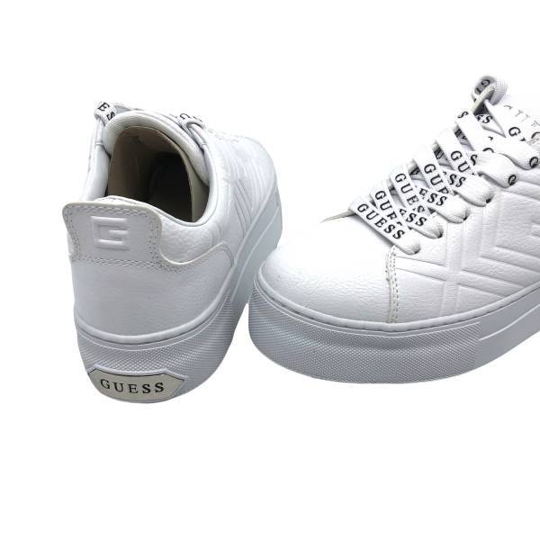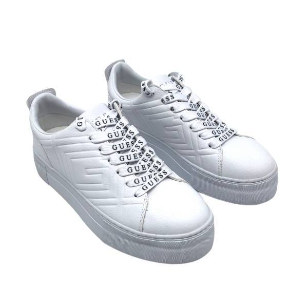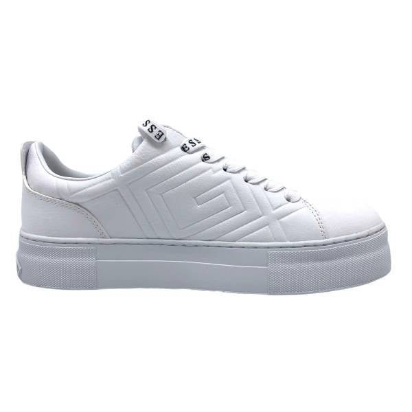 La Sneaker firmata Guess, realizzata in morbida similpelle in colore bianco con pattern logo tono su tono. Dispone di talloncino con logo, e suola in gomma con targhetta con logo.