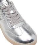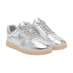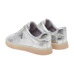 La Sneakers firmata Guess, realizzata in morbida pelle laminata qui proposta nella variante argento è caratterizzata da targhetta triangolare logata posizionata lateralmente e da interno e sottopiede estraibile sono foderati in tessuto.